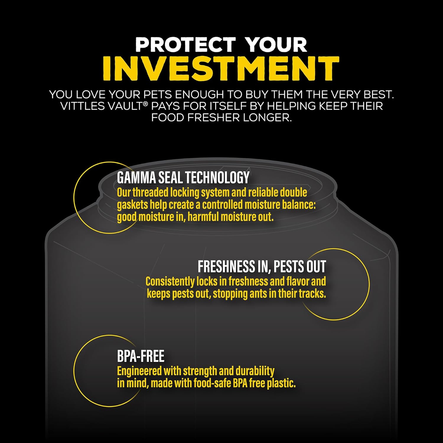 - Say Goodbye to Pesky Pests: In addition to locking in freshness and flavor, GAMMA SEAL TECHNOLOGY keeps pests out, stopping ants and other insects out of this cat or dog food storage vault. Perfect for dry pet food