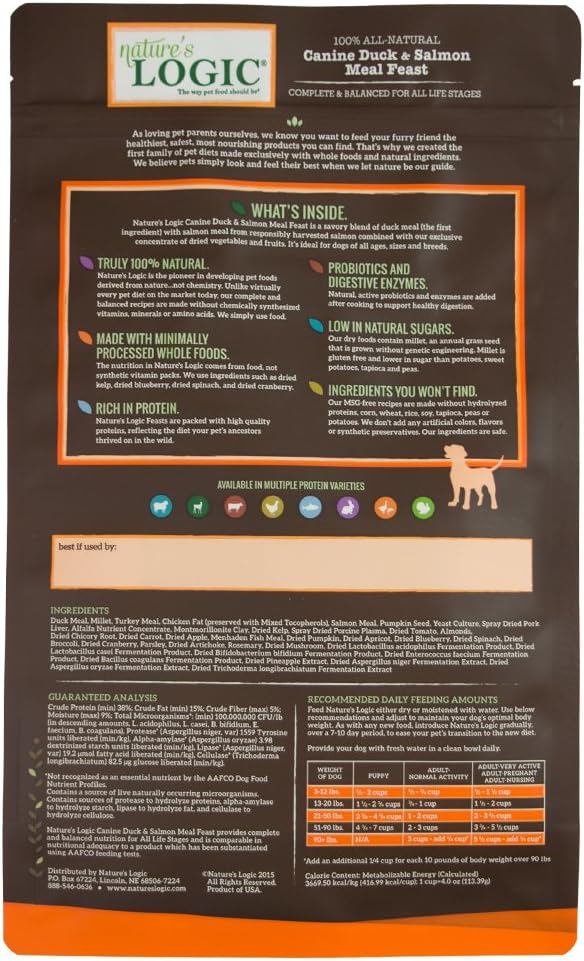 - HIGH PROTEIN FOR STRONG MUSCLES: Nature’s Logic Canine Duck & Salmon Meal Feast provides 87% of its protein from high-quality meat sources, with duck & salmon meal as the main ingredient. This ensures your furry friend builds strong muscles, perfect for keeping them active and healthy throughout their life.