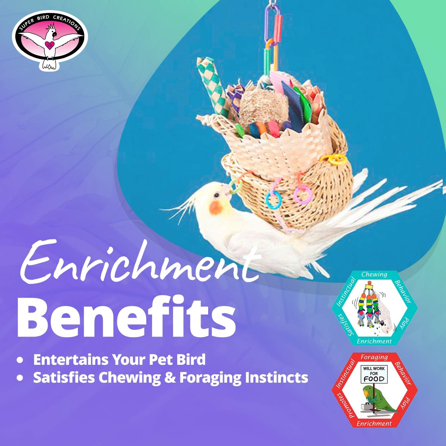 - BANISHES BOREDOM: Super Bird Creations parrot toys are "Playthings with a Purpose." They effectively combat boredom, depression, aggression, and destructive behaviors by stimulating physical activity, curiosity, and mental engagement in your feathered friend.