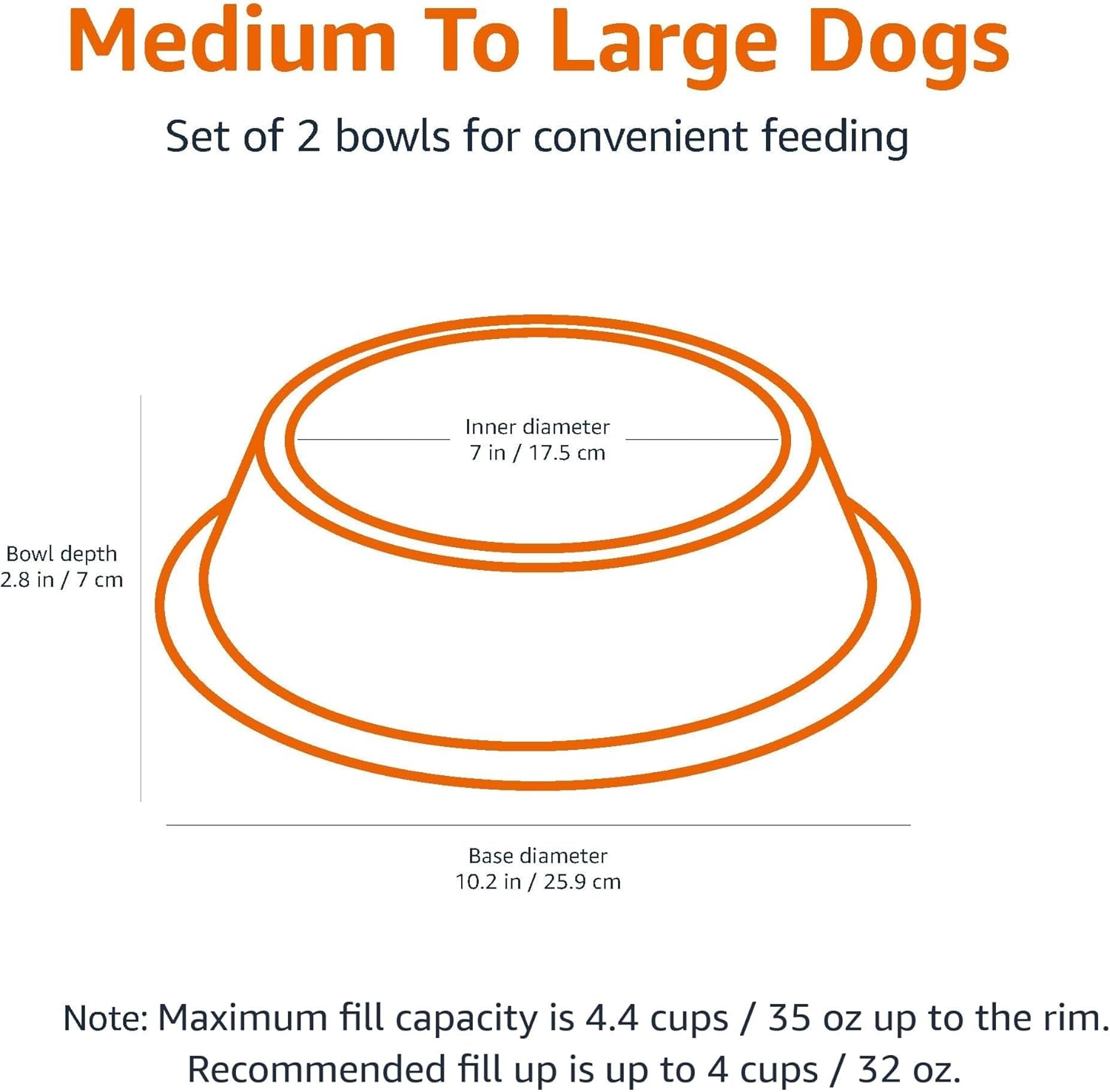 - Max fill (to the rim) 35 oz / 4.4 cups each bowl, recommended fill up to 32 oz/ 4 cups, perfect for dry kibble, wet food, treats, or water.