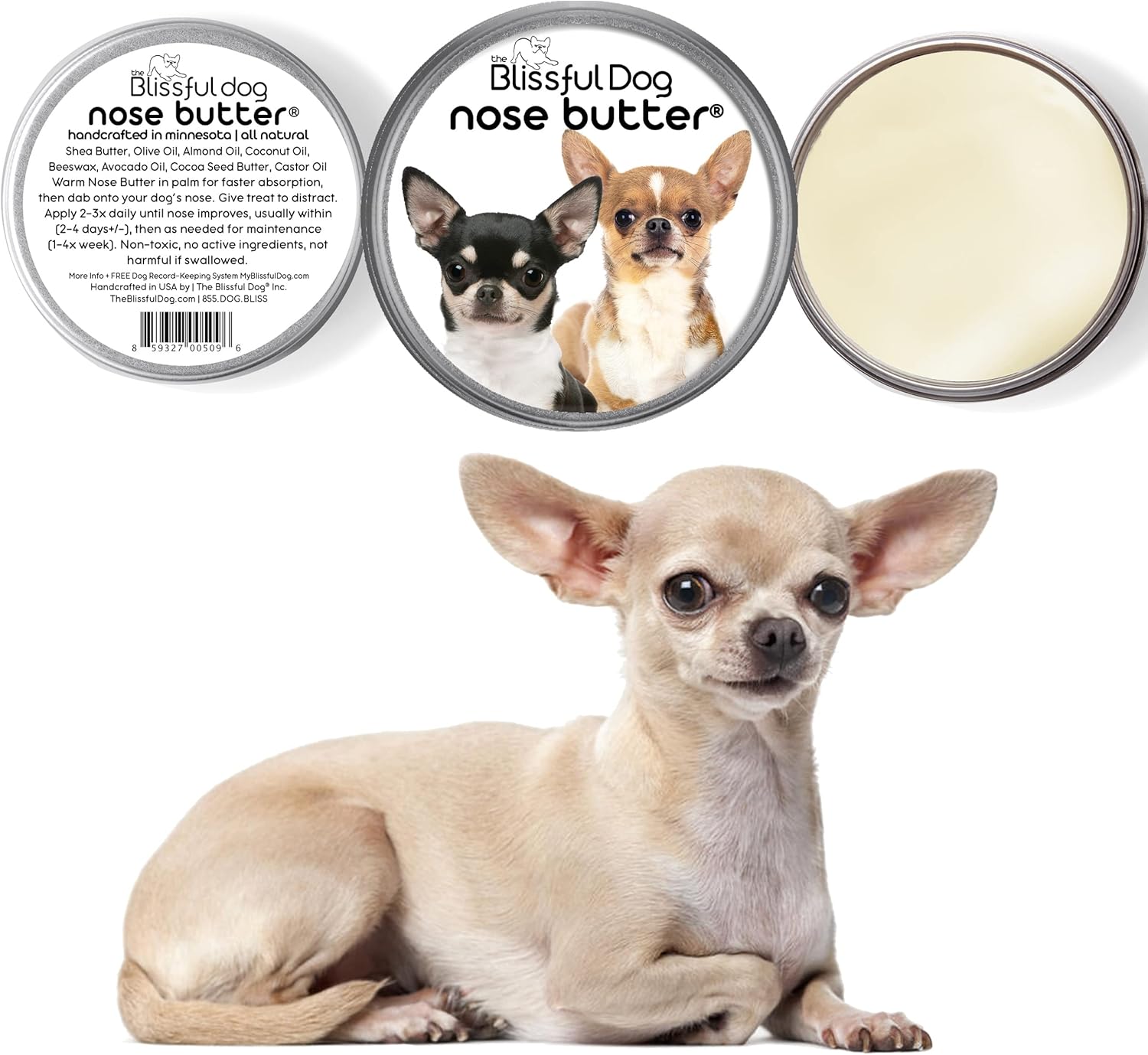 The Blissful Dog Smooth Coat Chihuahua Nose Butter for Dry, Cracked Skin, Lick-Safe Dog Nose Balm with Moisturizing Shea Butter, Almond, Olive, and Essential Oils, Pet Supplies, Uncented, 4 oz.