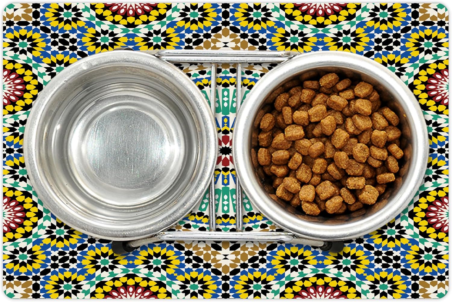 Lunarable Moroccan Pet Mat for Food and Water, Architectural Glaze Wall Tile Ceramic Historical Traveling Destinations, Non-Slip Rubber Mat for Dogs and Cats, 18" X 12", Khaki Blue