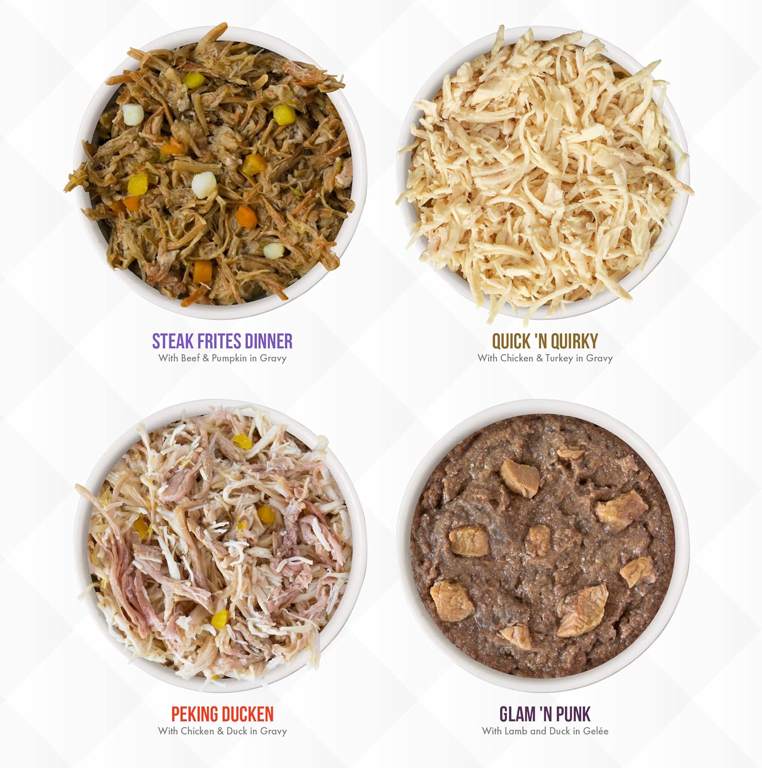 - Variety Pack includes 6 each of: Steak Frites, Peking Ducken, Quick & Quirky, and Glam & Punk