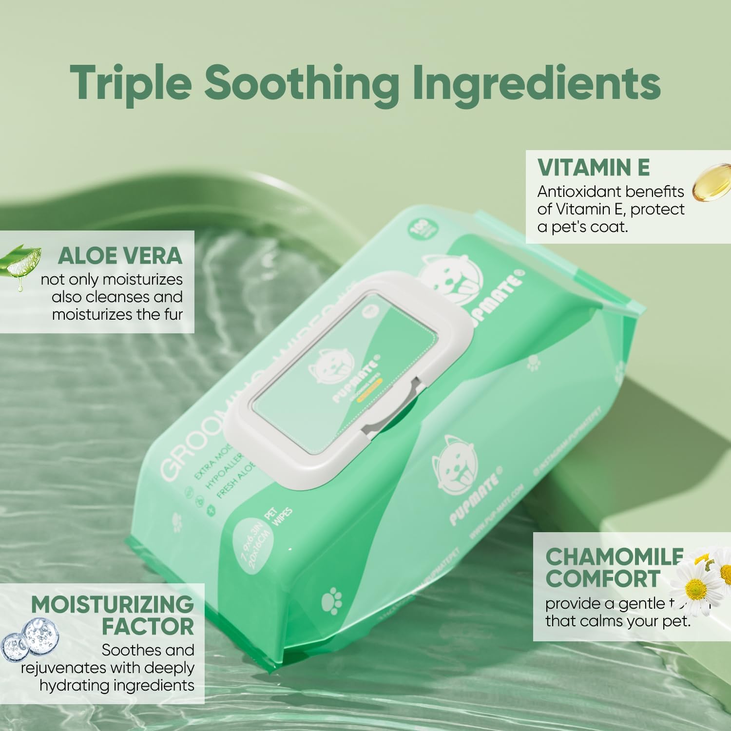 - GENTLE FORMULA: Rooted in the essence of natural goodness, PUPMATE pet wipes are crafted with ingredients like soothing aloe vera and vitamin E. Our pet wipes for dogs and cats symbolize gentle affection for your pets, delivering nourishment and care with each use. Vitamin E, a cornerstone of our formula, preserves healthy skin, embodying our commitment to the holistic well-being of your beloved companion