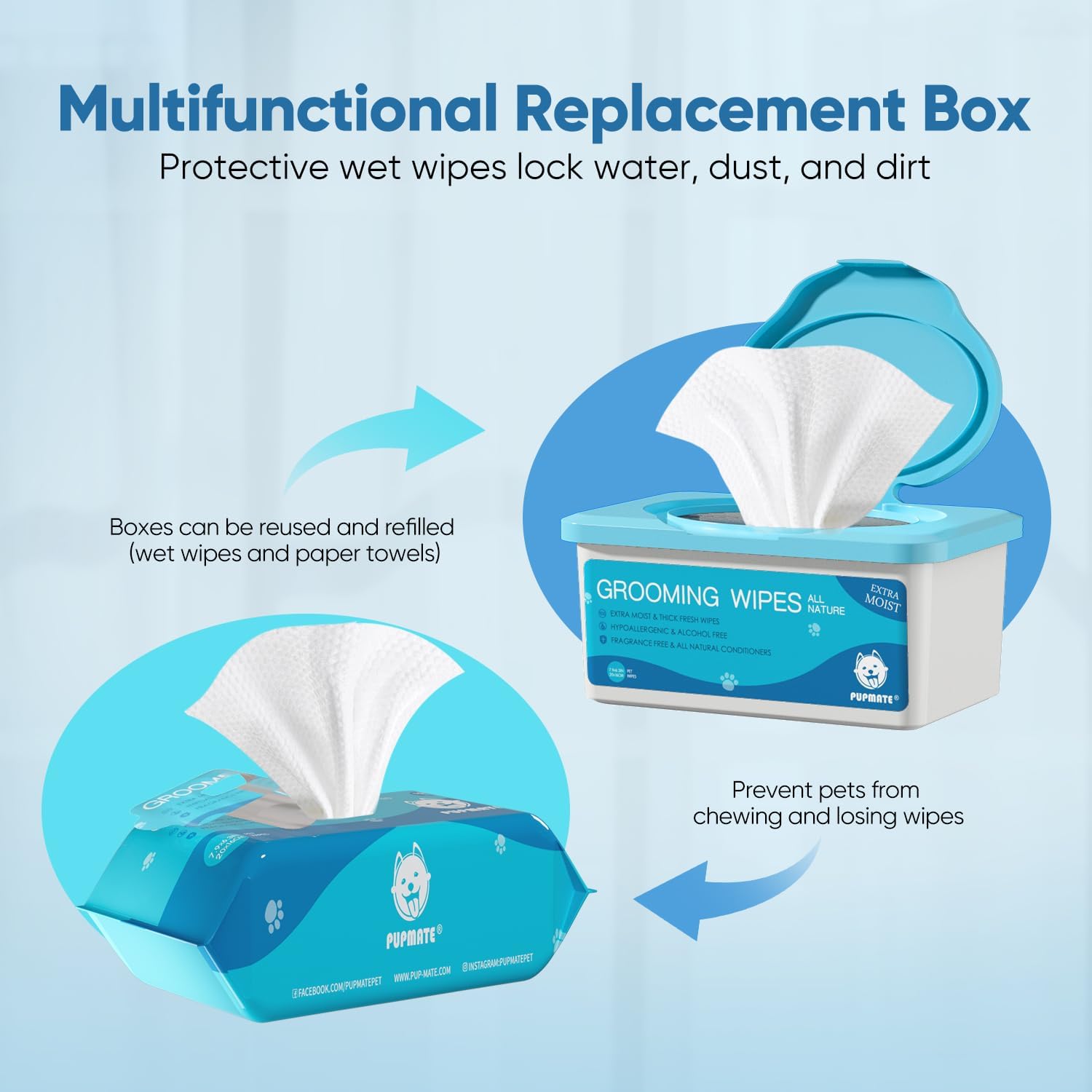 - CONVENIENT STORAGE AND DISTINCTIVE BOX DESIGN: The PUPMATE experience is about convenience, and our pet wipes exemplify this principle. Encased in a moisture-sealed box that shields them from dust and light, they're primed for use at a moment's notice. Be it your adventures outdoors or cozy moments at home, our dog wet wipes take on the role of unwavering protectors, an indispensable resource for your pet's joy
