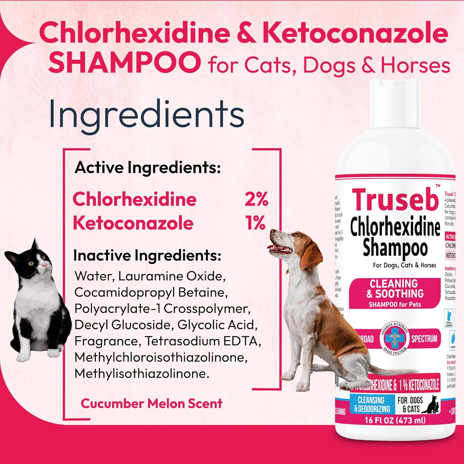 - Shampoo That’s Effectively Helps Skin Issues - Truseb Chlorhexidine Shampoo is made with Chlorhexidine and Ketoconazole for the safest and most effective way to helps your dog or cat's skin issues right in your own home. The shampoo is has a light cucumber melon scent to help combat smelly skin issues. Our advanced formula deodorizes the fur, helps remove knots from fur, and makes it nice while soothing their skin and providing purifying and hydrating properties.
