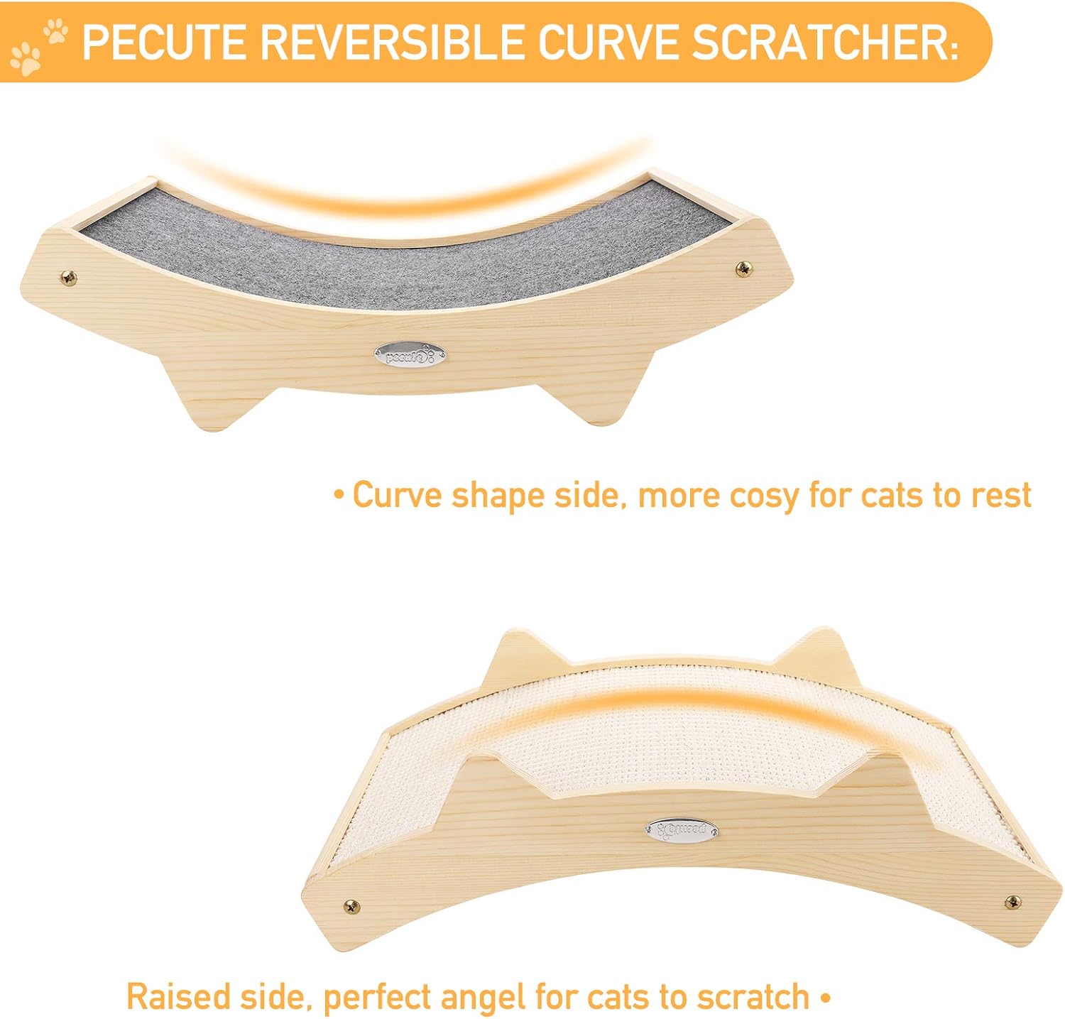 - 2 IN-1 DESIGN, HAPPIER CAT & OWNER : Pecute's reversible curve cat scratcher [ Natural Sisal Side + Carpet Side+ Solid Wooden Construction ] offers great value for your money, outlasting other cat scratchers that get torn apart quickly, offer your cat 2 in 1 designs for scratching & lounging fun. Designed for saving your furniture! Its modern and smart design nicely blends into most home décor.