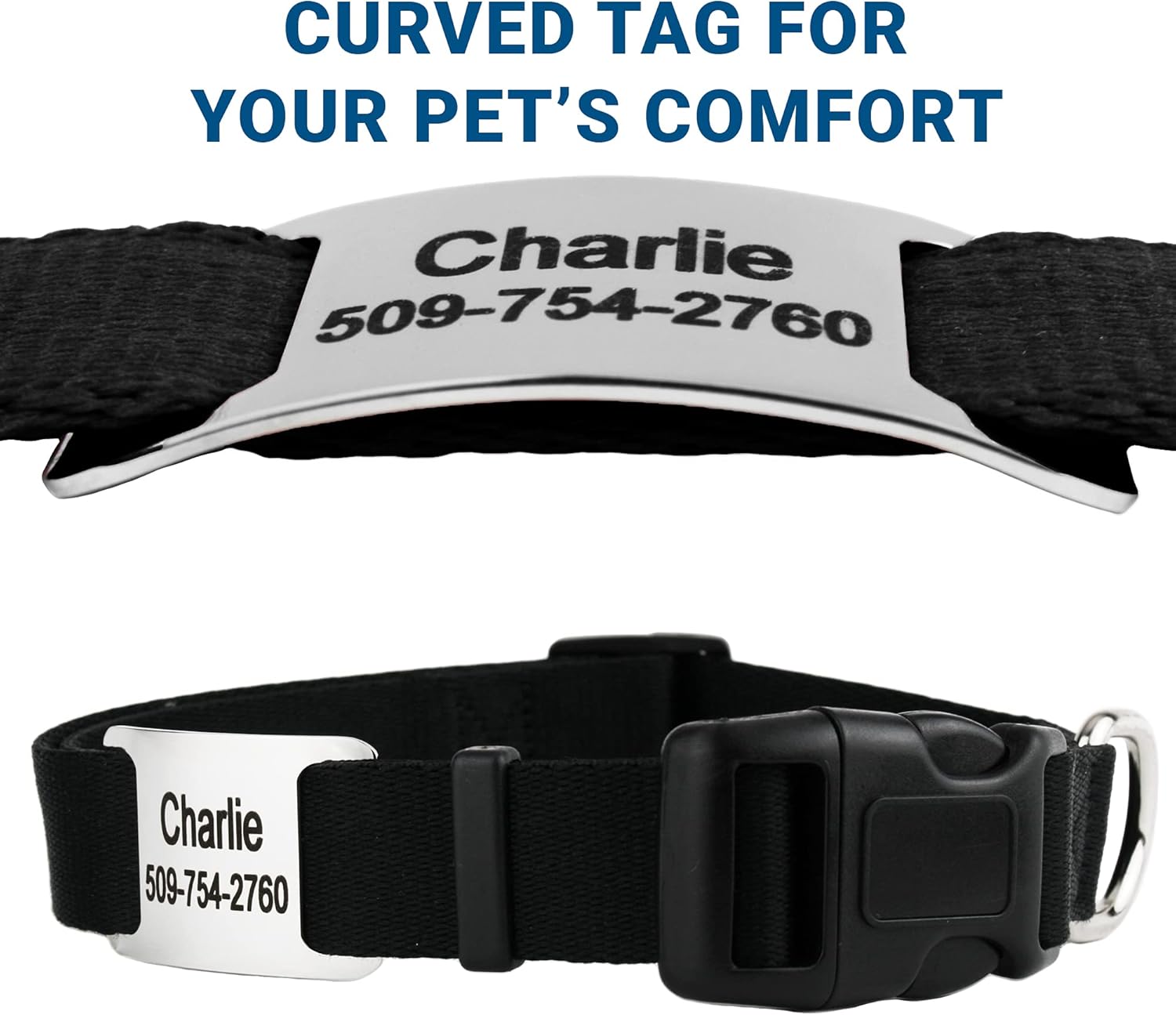 GoTags Personalized Dog Collar with Nameplate, Adjustable Dog Collar with Custom Engraved Slide On Pet ID Tag in Stainless Steel, Silent, No Noise Dog Tag for Large Medium and Small (Black, X-Small)