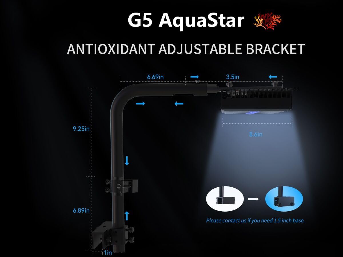 - FLEXIBLE ALUMINUM AQUARIUM STAND - Special Anti-rust design flexible full aluminum with oxidation bracket suitable for different size of coral tanks. Oblate base efficiently increase stressed area and protect coral reef tank well. Ideal coverage of G5 coral light is 20-28 inch. Tank glass thickness: 0.2-1.0 inch