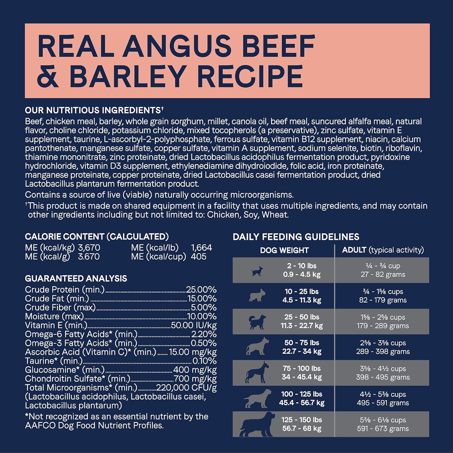 - Real food ingredients for the taste your dog will love. Crafted with real angus beef as the first ingredient, paired with wholesome grains like barley, sorghum and millet