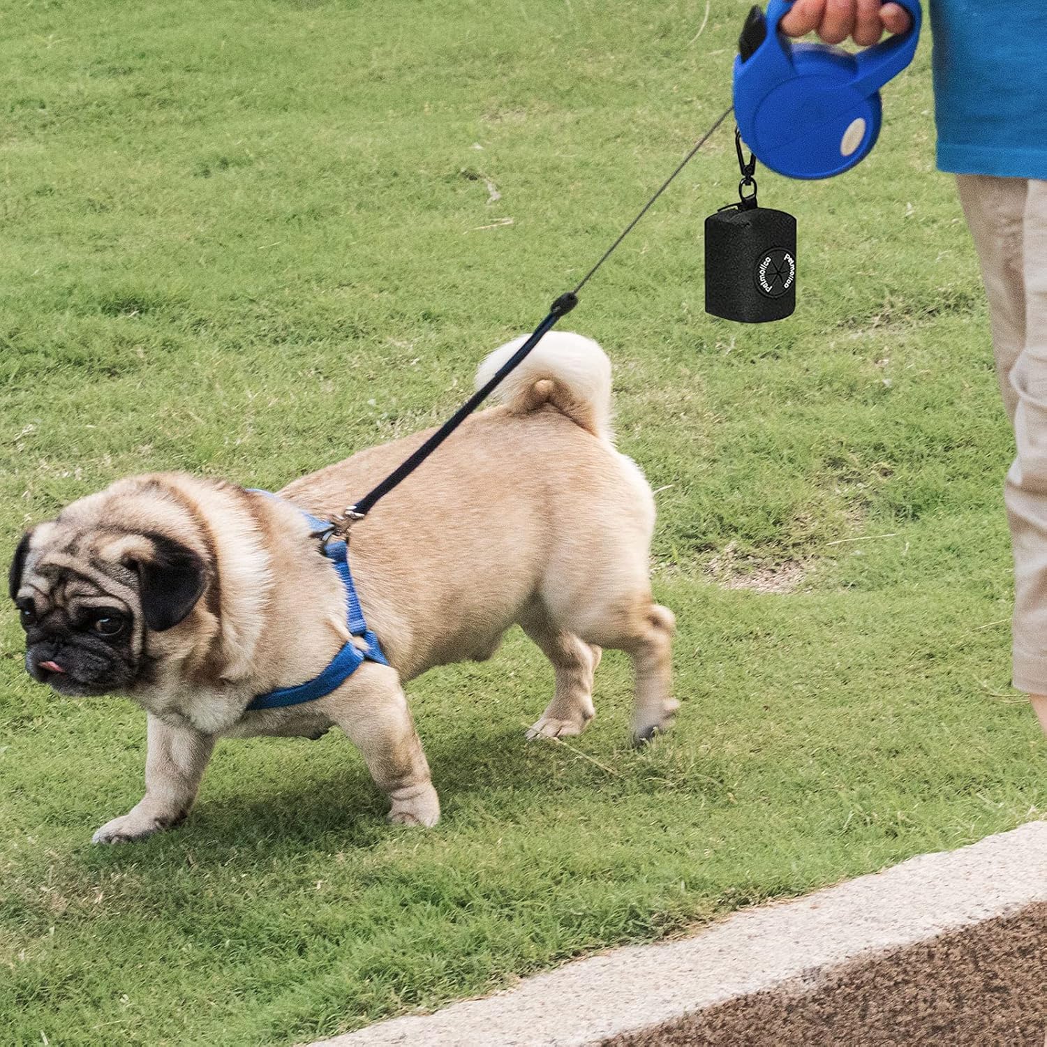 - The lightweight dog poop bag dispenser easily secures flat to any dog leash or use the metal button to attach it onto your dogs collar or harness.