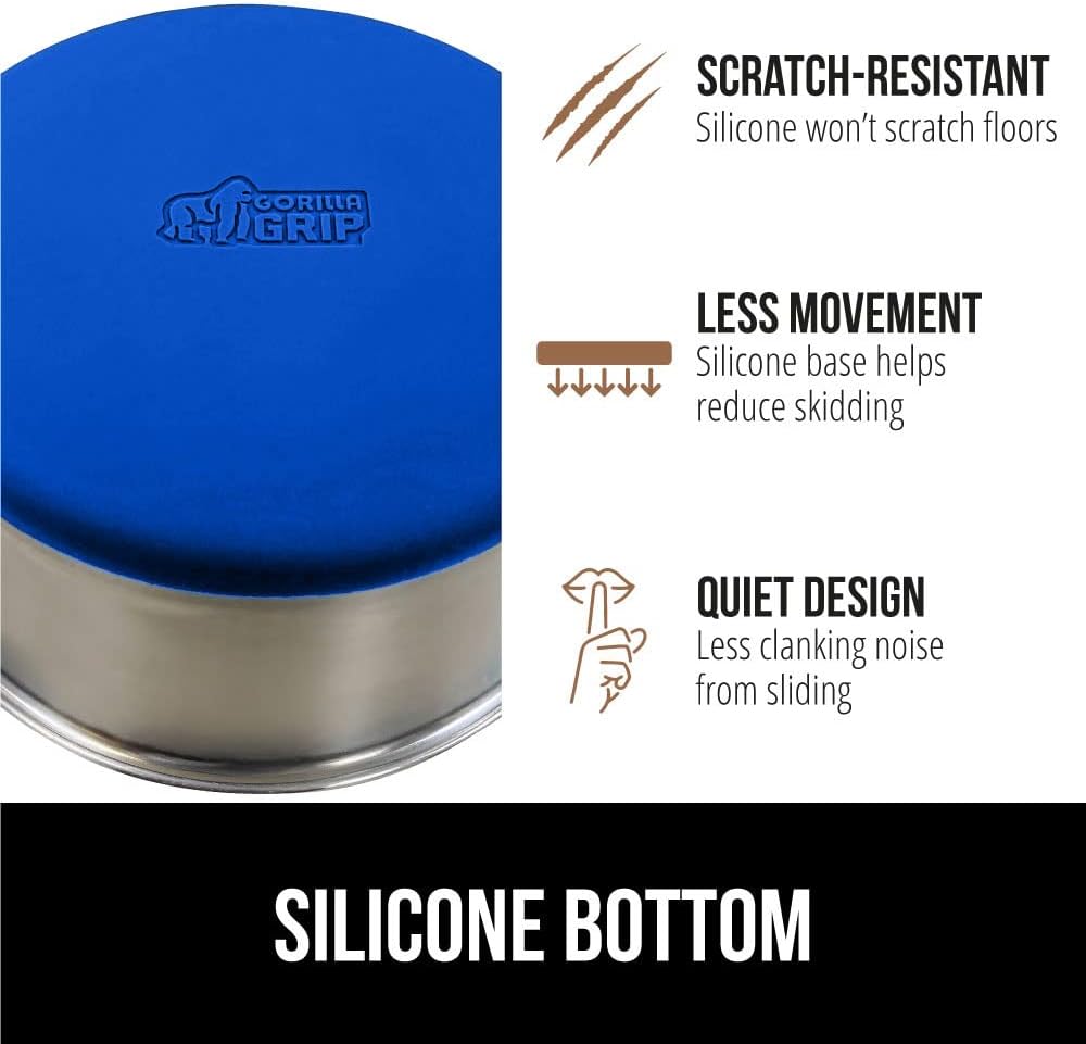 - SILICONE BOTTOM: the Gorilla Grip bowl is constructed from durable silicone that helps keep the bowl steady and wonโt scratch your floors; while some over eager eaters may still be able to slide the bowls, the silicone will help prevent much movement; plus, it reduces the noise from clanking and sliding across wood, tile, and more