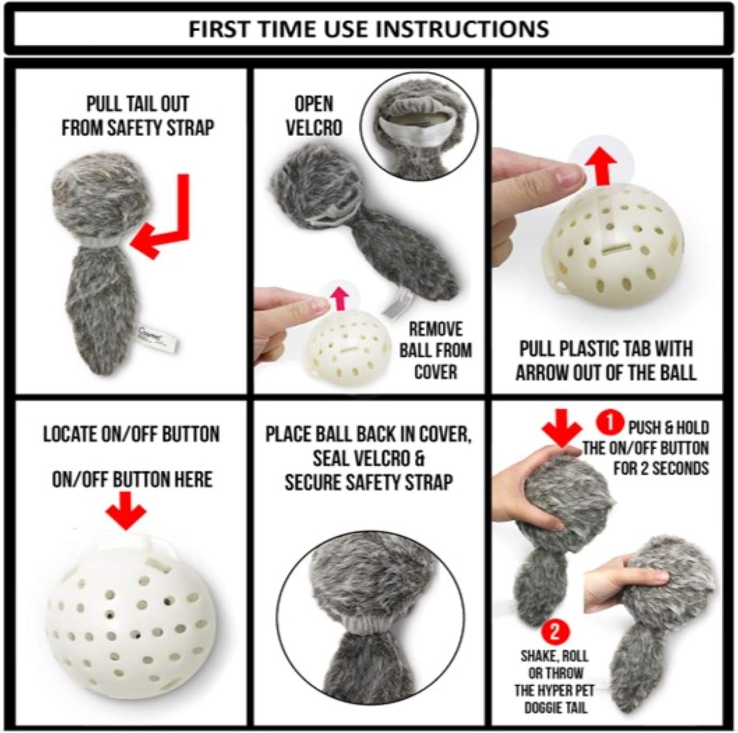 - TIPS TO ACTIVATE – On/Off button on this plush dog toy is located on the top of the plastic ball. Press the button and hold for 2 seconds to turn the ball on. To activate, shake, roll, or throw Hyper Pet Doggie Tail. The random motion will continue for approximately 10 seconds. Once action stops, rock, roll, or throw the interactive dog toy again to reactivate and continue play. When playtime is over, simply press the button to turn the dog ball off.