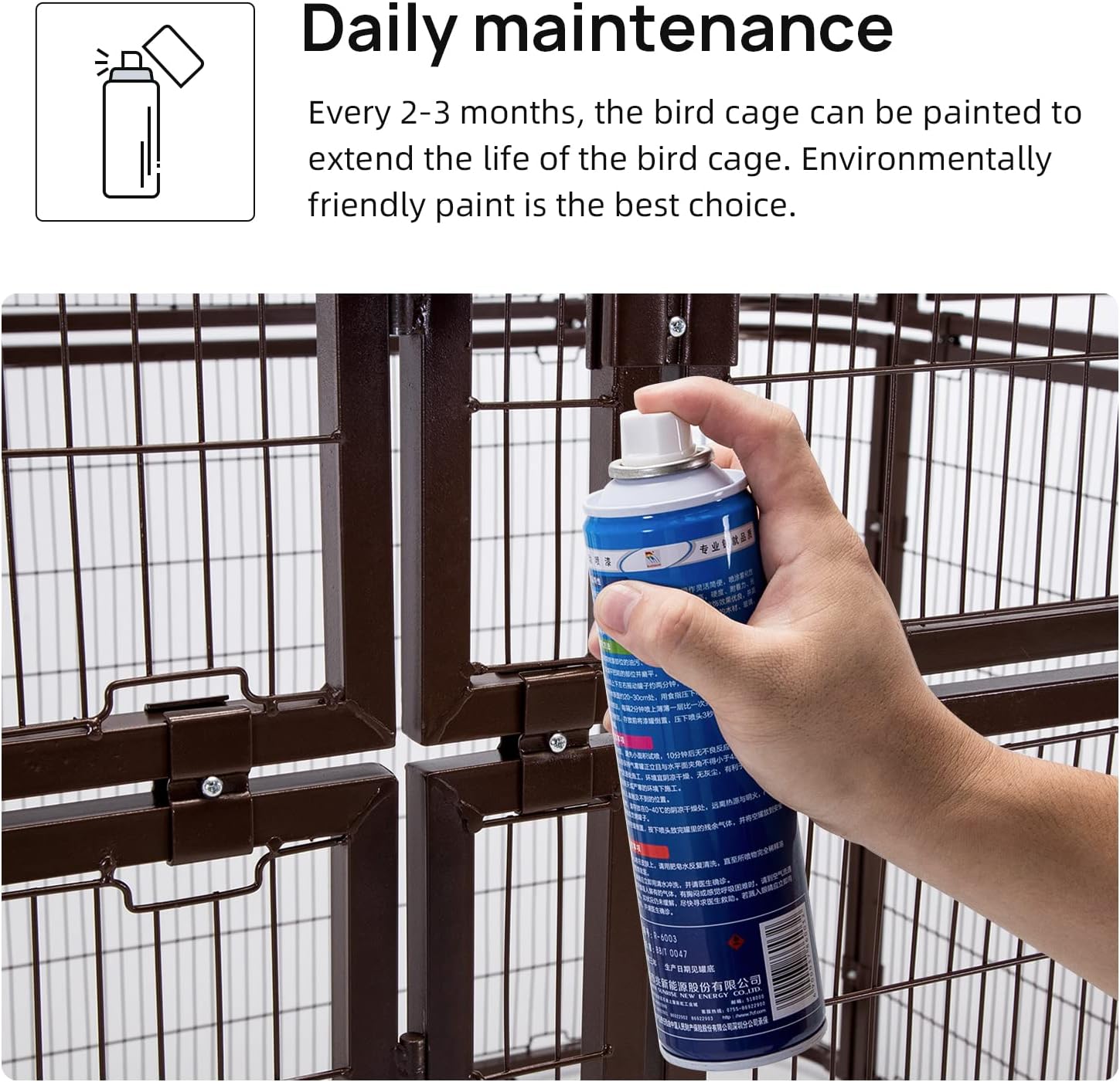 - Security - Welded stainless steel coated with a non-toxic powdered finish avoids birds' chewing & Suitable bar space prevents the risk of bird’s escaping.