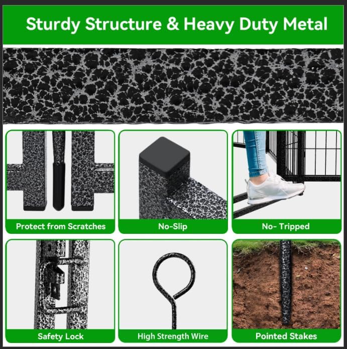 - 【Sturdy Structure & Stable Ground Stakes】Kfvigoho metal stakes are designed round top, which can be pounded into the ground for greater stability, this dog fence with sturdy structure, so dogs can't knock it down and keep them confined in a safe area, the pet pen works great for small, medium and large dogs and rabbits, ducks, turtles etc