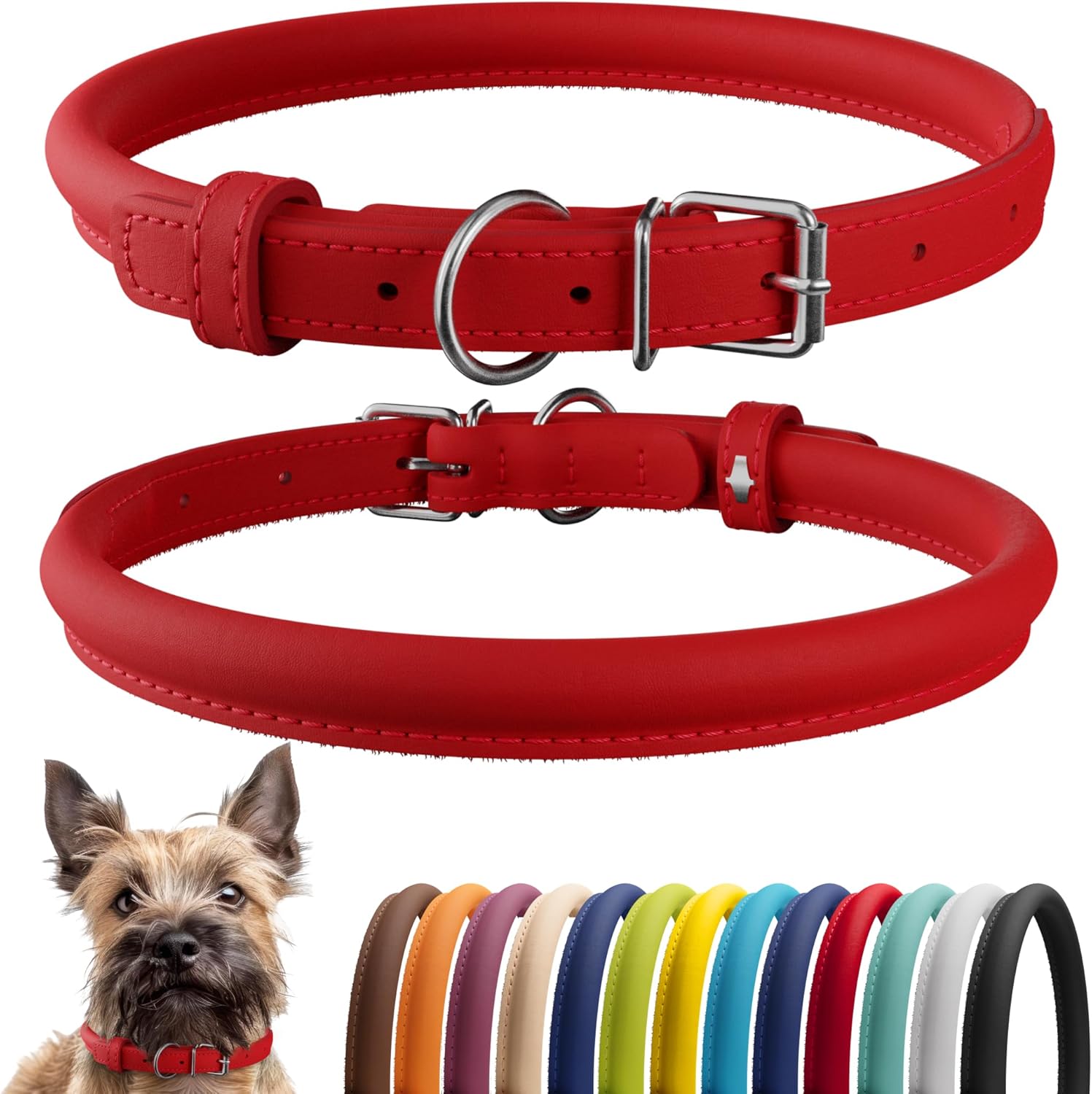 CollarDirect Rolled Leather Dog Collar, Soft Padded Round Puppy Collar, Handmade Genuine Leather Collar Dog Small Large Cat Collars 13 Colors (8-11 Inch, Red Smooth)