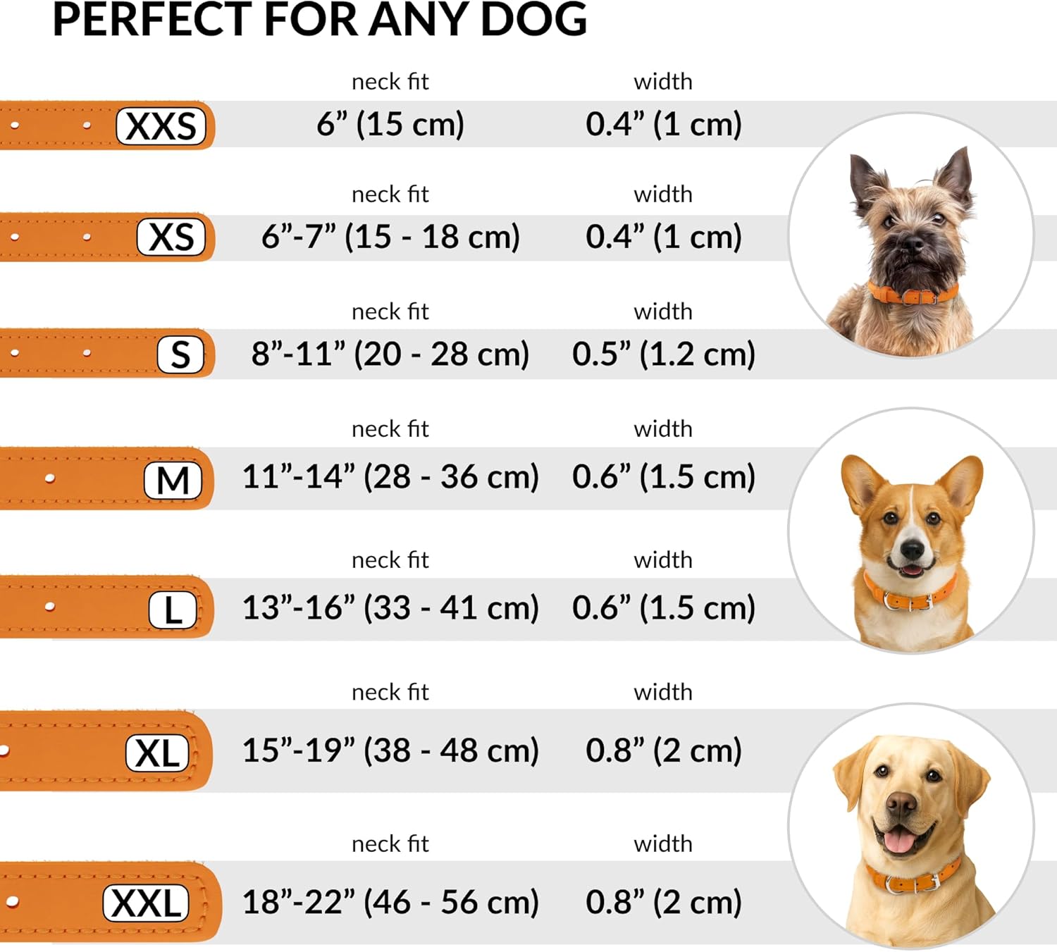 - SUITABLE FOR ALL BREEDS: Our dog collars for small dogs and big dogs come in a variety of sizes. Please check out our size chart before purchasing a leather collar for dogs. The dog collar leather is 0.6 inches wide, 19 inches long, and neck sizes of 13 - 16 inches.