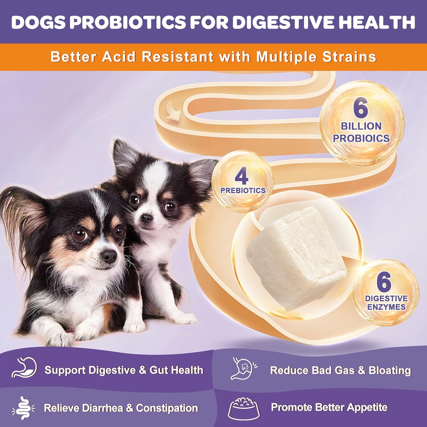 - Support Digestive and Gut Health: Our dog probiotic contain 6 billion CFUs and 12 strains of flora that support your pet's tummy. The main soil-based probiotic blend is especially resistant to stomach acid and bile. We also add prebiotics that helps nourish the growth of probiotics. And digestive enzymes can break down food and promote nutrient absorption. It helps relieve bad breath, bloating, diarrhea, constipation and vomit, and help form stools and support sensitive stomach for your pet.