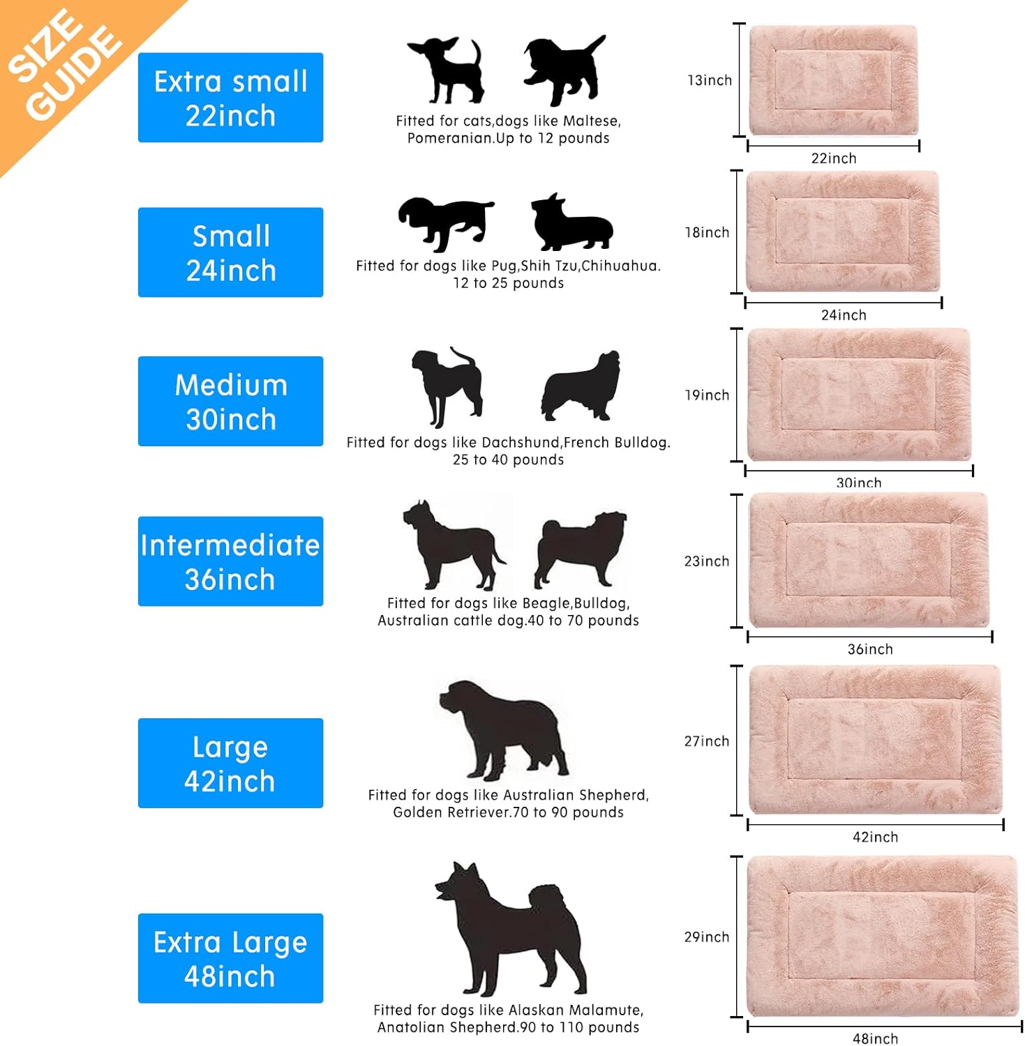 - SIZE GUIDE: Ideal dog bed for wire dog crates.This pad measures approximately 48inch*30inch.Fit for dogs weighing 90 to 110 pounds such as Alaskan Malamute,Anatolian Shepherd.