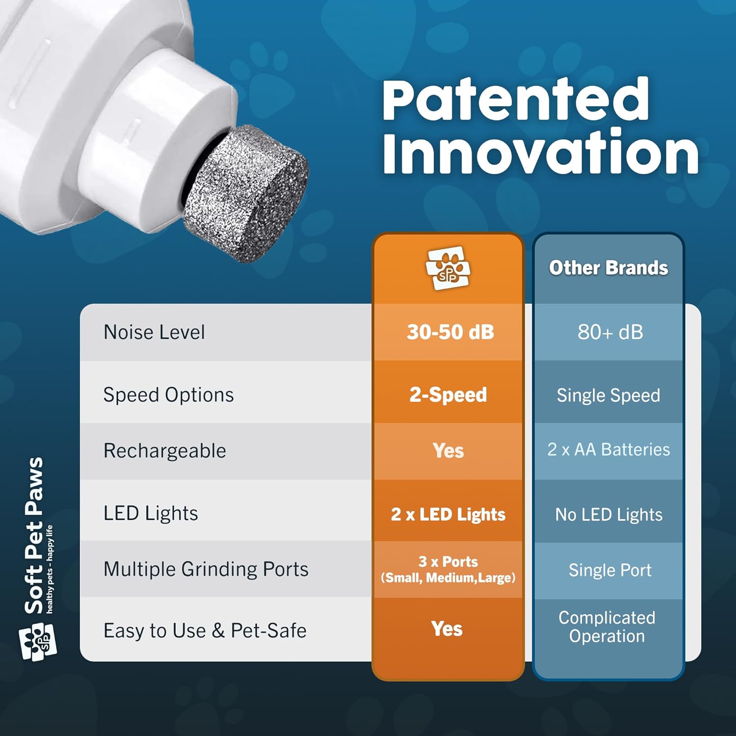 - Safer Design with 2 LED Lights: The Soft Pet Paws electric dog nail trimmer features 2 LED lights that make it easier to see the dog's nail area and prevent over-grinding. These dual LED lights provide a more accurate shine than other grinders, making the grooming process safer and more precise