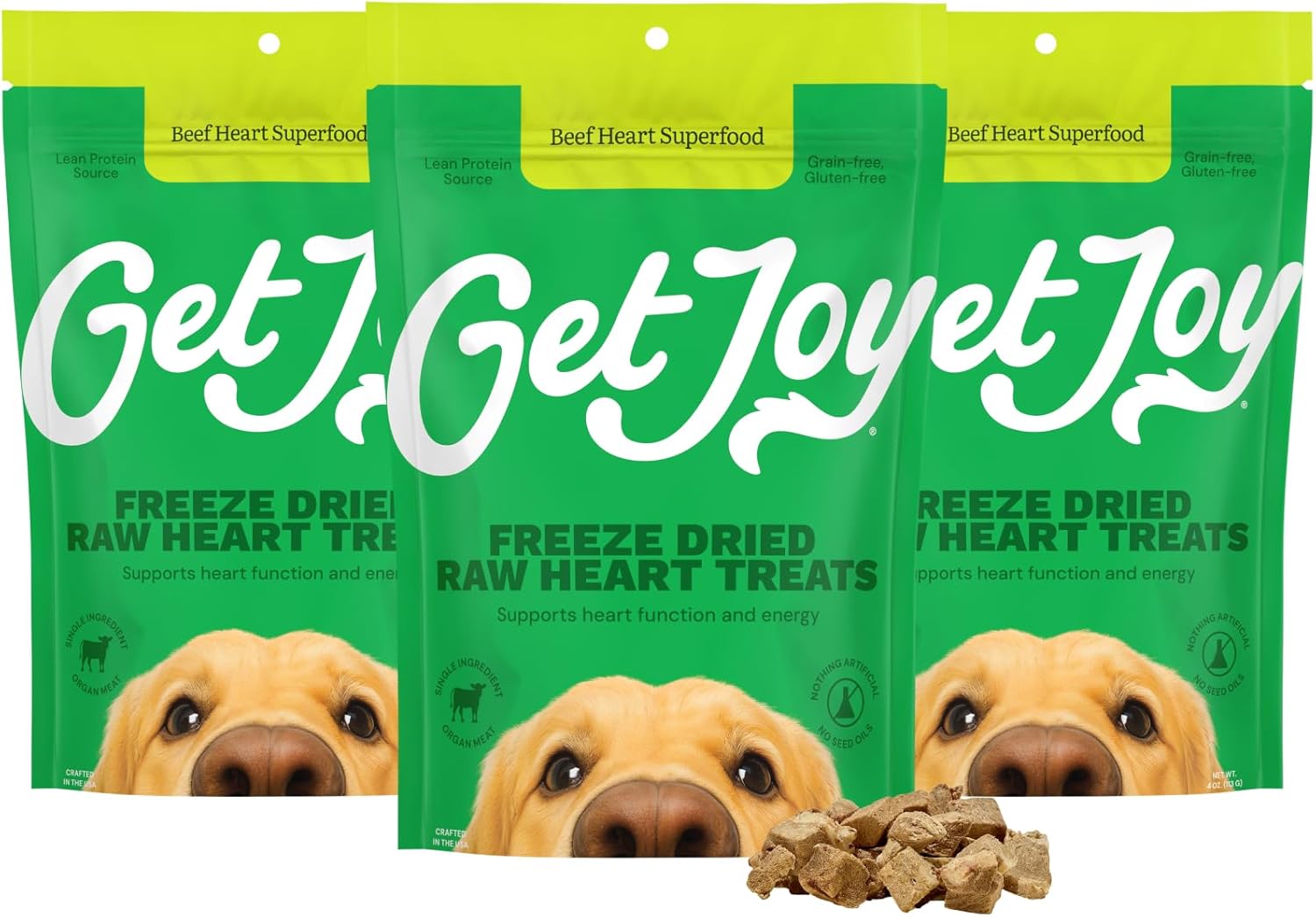 - Contains: (3) 4- Ounce Resealable Bags of Get Joy Freeze Dried Superfood 100% Beef Heart Dog Treats. Freeze dried to lock in 97% of nutrients from raw, fresh ingredients, while preserving shelf life