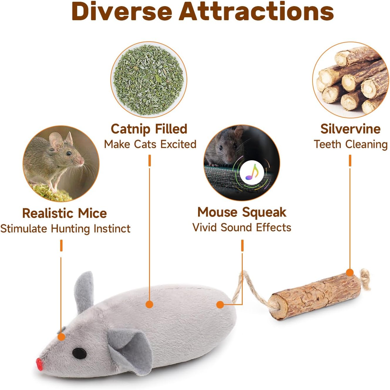- Care for Oral Health: When cats play with these cat mice toys, they effectively eliminate dental plaque and tartar, helps clear off fetid breath and improve oral health for your furry babies. The healthier your cats are, the closer you get together