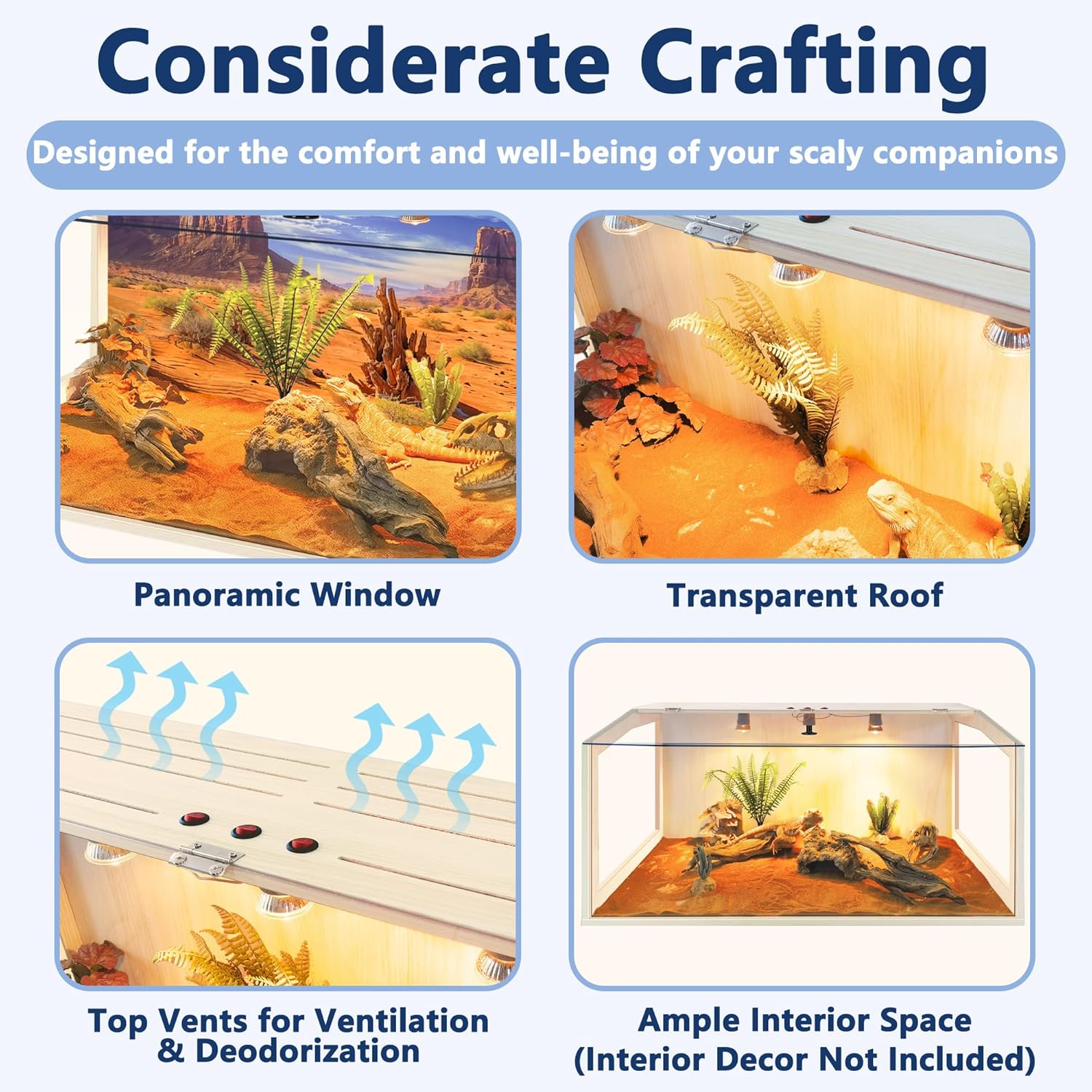 - ăConvenient Bulb SocketsăEquipped with built-in bulb sockets and switches (three in the 40/48-inch version), our terrarium accommodates various E27 bulbs for heating, lighting, and night illumination (bulbs not included). Installing the lights is a breeze, making it an ideal habitat for your reptiles.