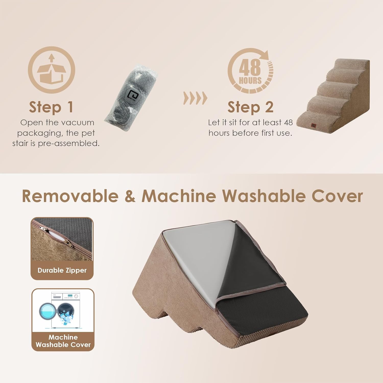 - MULTIPLE STEP SIZES - This dog stair has 2 steps, 3 steps, 4 steps and 5 steps to choose. Our 2-step stairs fits for chair/sofa/bed up to 13inch. 3-step stairs fits for chair/sofa/bed up to 17inch. 4-step stairs fits for chair/sofa/bed up to 21inch. And 5-step stairs fits for chair/sofa/bed up to 24inch.
