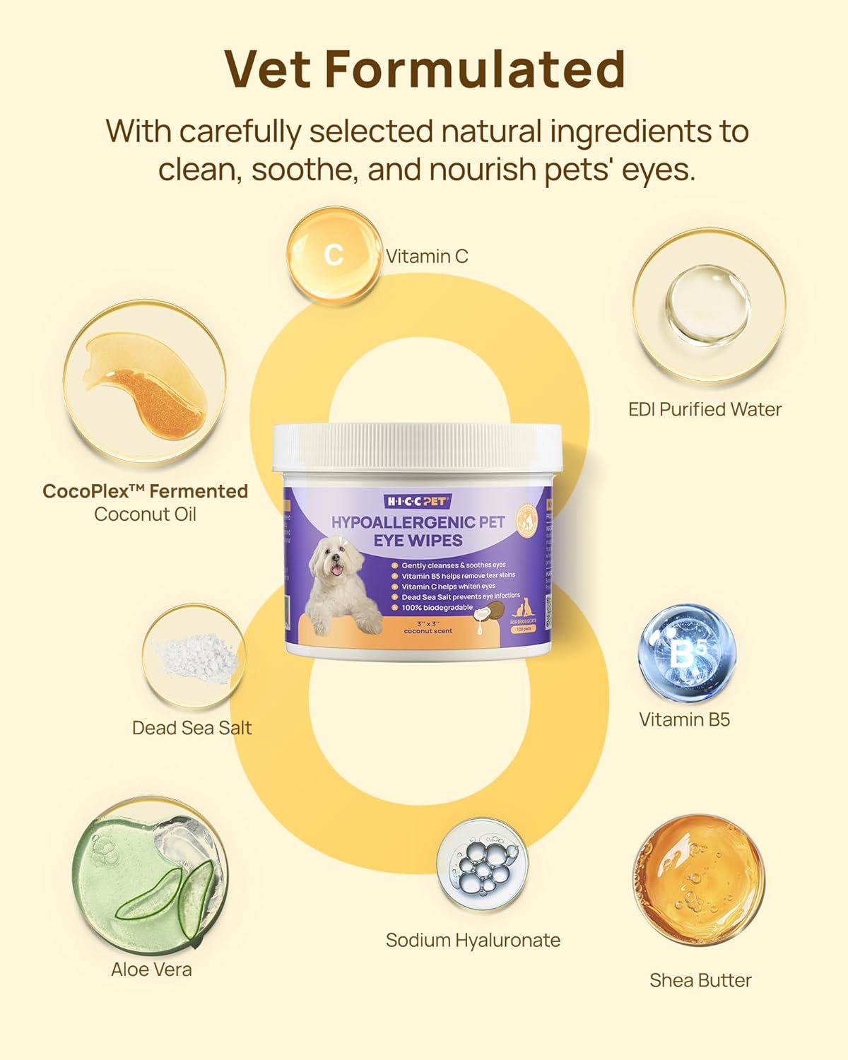 HICC PET Eyes Wipes for Dogs & Cats - Gently Remove Tear Stain, Debris, Discharge, Crust - Coconut Oil Pet Cleaning Grooming Deodorizing Wipes Wash Cleaner for Eyes, Wrinkle, Face - 100pcs