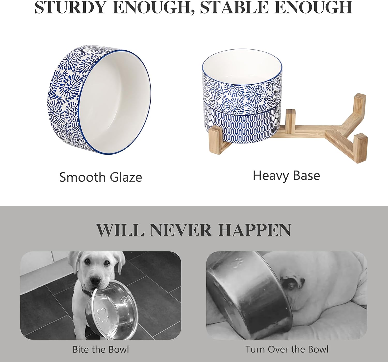 - DOUBLE BOWLS, DELICATE DESIGN - The thoughtful design of these double bowls offers convenience for your pets. You can use one bowl for food and another one for water, raising the dishes closer to your pet for more comfortable eating. Decorated with blue flowers and geometric patterns, these make them more unique that fit perfectly with any home decor style.