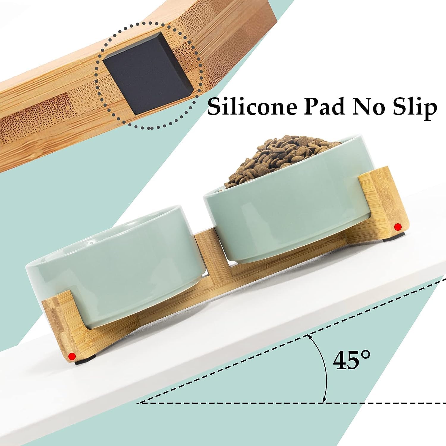 - [Double Bowl Design]:One dog bowl for food and one for water, Each ceramic cat bowl has a Unique wooden stand, raising the dishes closer to your pet for more comfortable eating