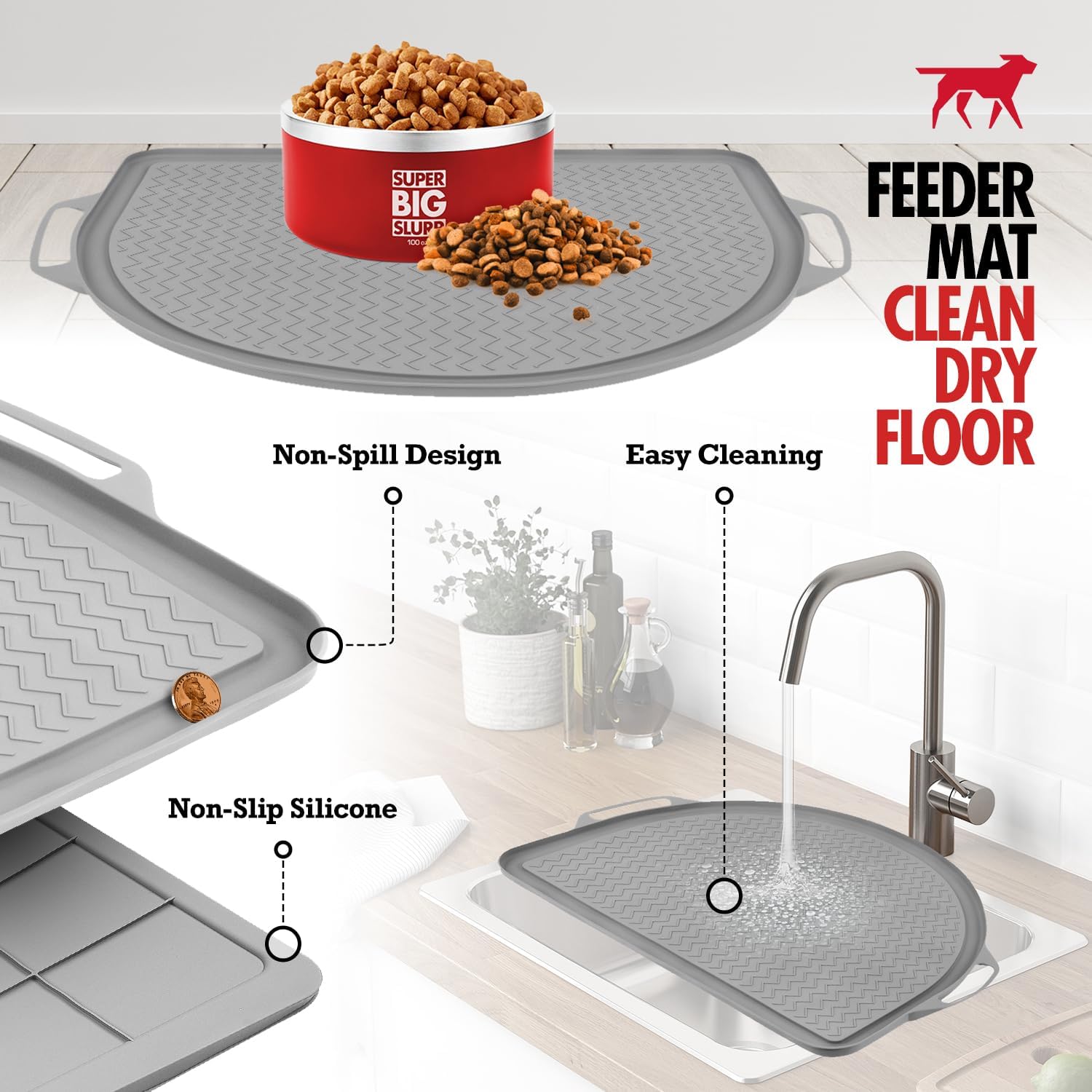- JUMBO SIZE FOR ALL BREEDS – 26"x21" silicone mat big enough for extra large bowls, multiple bowls, gravity water dispensers, fountains and elevated feeders to contain all your dog's messy eating from ever touching the floor!