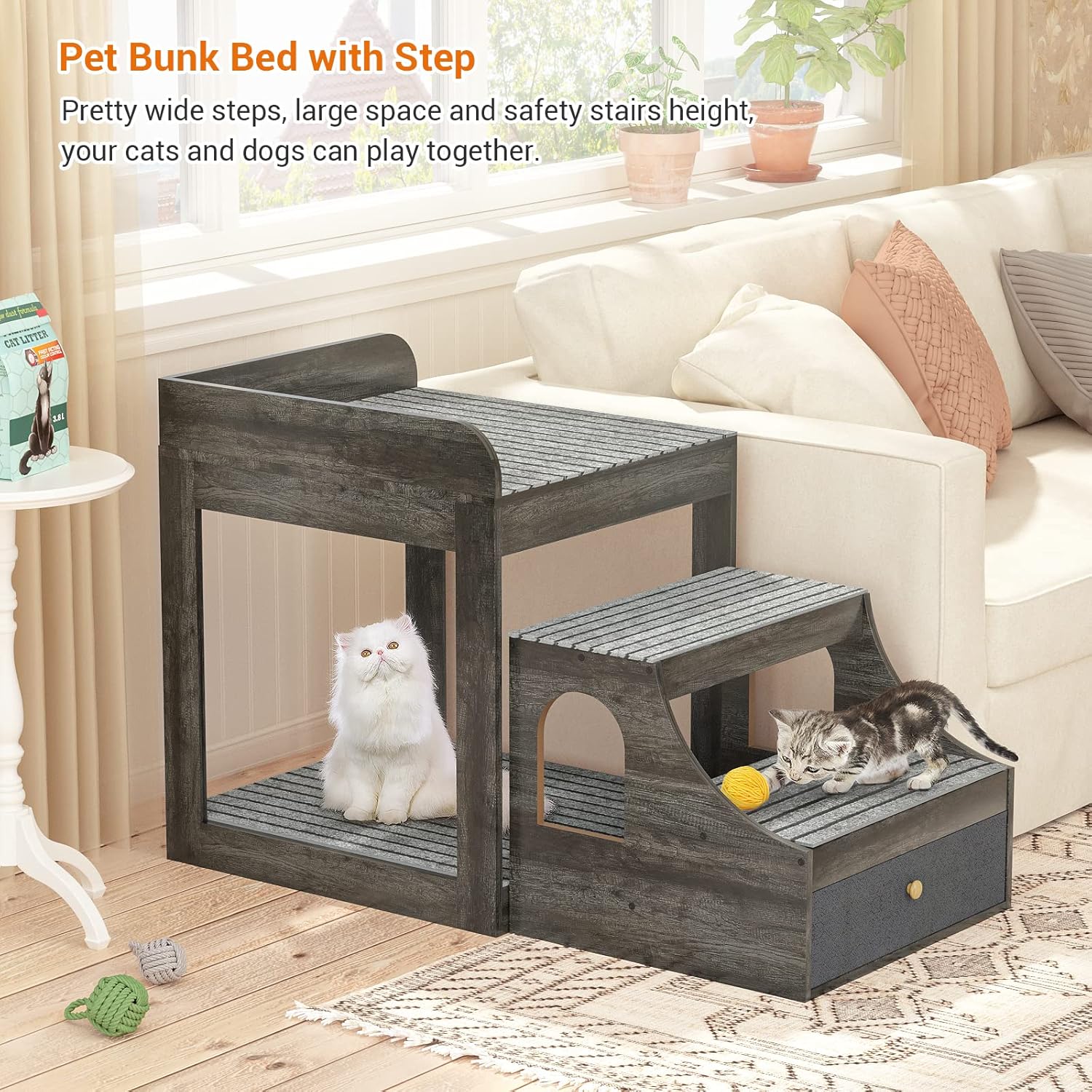 - 🐾 Large Space with a Storage Drawer - The space underneath the bed is large too, so your dogs and cats can play together. The top bed space is 17.72*17.72 inches, providing a safe and large space to lie down and rest. It can hold up to 150 lbs. The drawer underneath the stair is large too, you can install your pet's toys and food too.