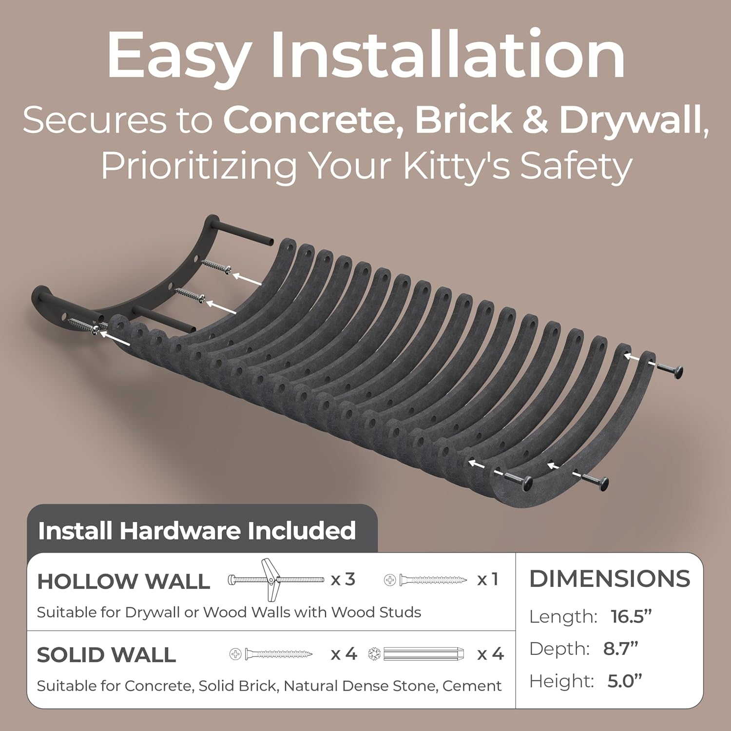 - Effortless Paradise: This cat hammock and wall bed includes all installation hardware, allowing your fur-baby to start exploring right away. Our cat climbing shelf securely attaches to concrete, cement, brick, dry wall and more ensuring your catās safety.