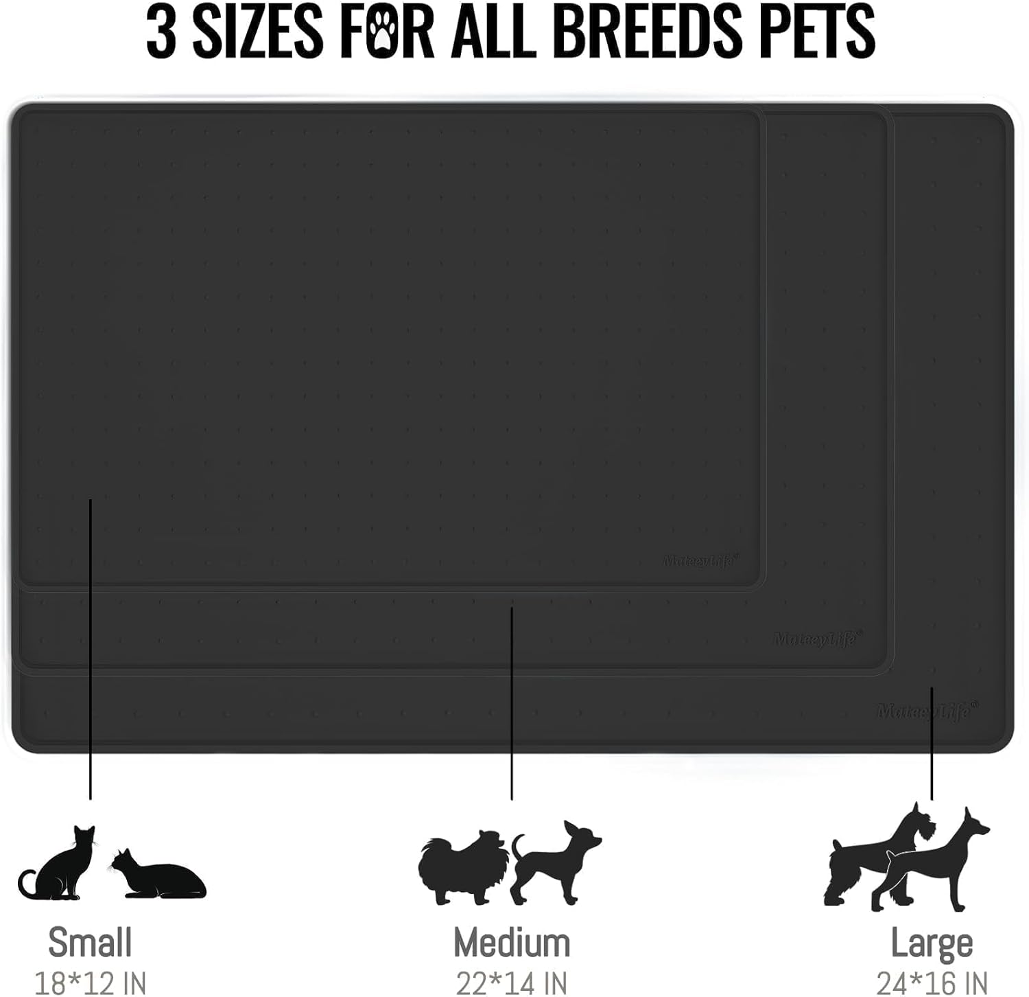 - For All Breeds Pets & Multi Scene: Our large silicone mat for dog bowls, cat food mats for indoor cats and cat mats for food and water come in three sizes and colors suitable for pet food and water bowls, pet fountains, raised feeders, and automatic feeders. What's more, they can also work as under sink tray, shoe mat tray, boot mat tray and cat feeding mat. For messy eaters, ensure at least 5 IN of clearance between the bowl and the edge of the mat to avoid water spilling when using