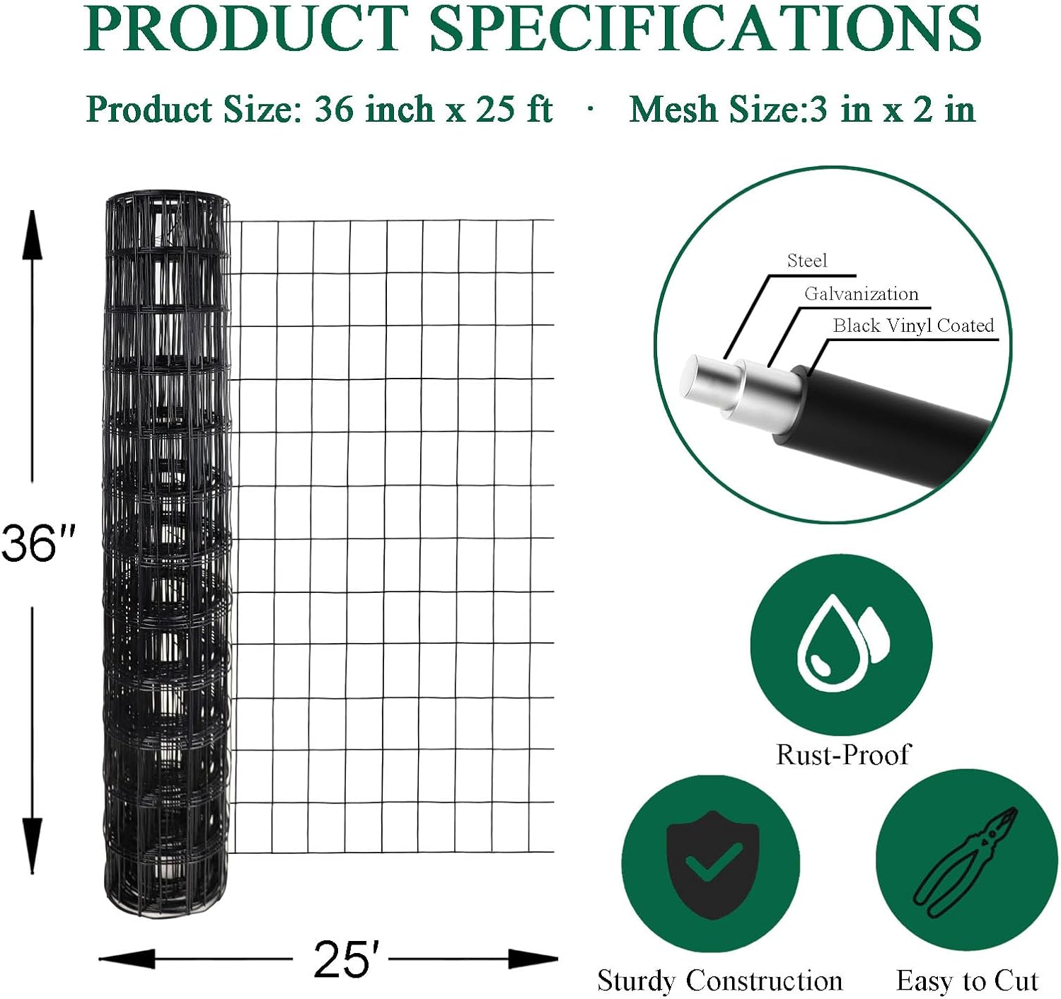 Black PVC Coated Welded Wire Fence 36 Inch x 25 Foot, 2 Inch x 3 Inch 16GA, Garden Border Fencing Roll Vinyl Coating Metal Wire Mesh for Yard Vegetable Plant Protection Poultry Netting