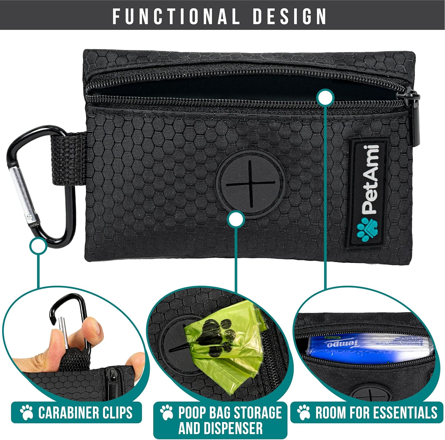 - 2 PACK DOG WALKING BAG: PetAmi poop bag holder dispenser includes one roll of dog poop bags, measures 5 x .25 x 3.25 inches, and is made of durable oxford polyester. Doggy trash bag carrier is refillable and is compatible with most dog poop bag rolls. This pet travel bag is a great gift for dog mom, dad, parents, owners, and trainers. Comes in multiple colors to mix and match your dog leashes.