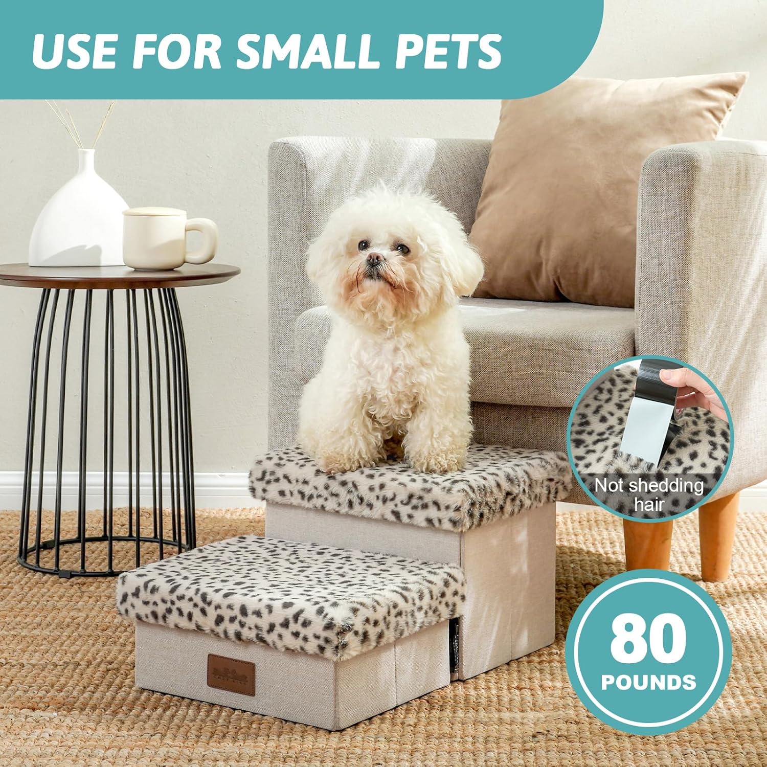 Dog Stair for Small Dogs with Storage, Foldable Pet Stairs for Medium or Puppy Dogs and Older Cats, Dog Steps for Bed or Couch with Soft Cover, 19.7x13x9.6 inch, 2 Tiers, Leopard