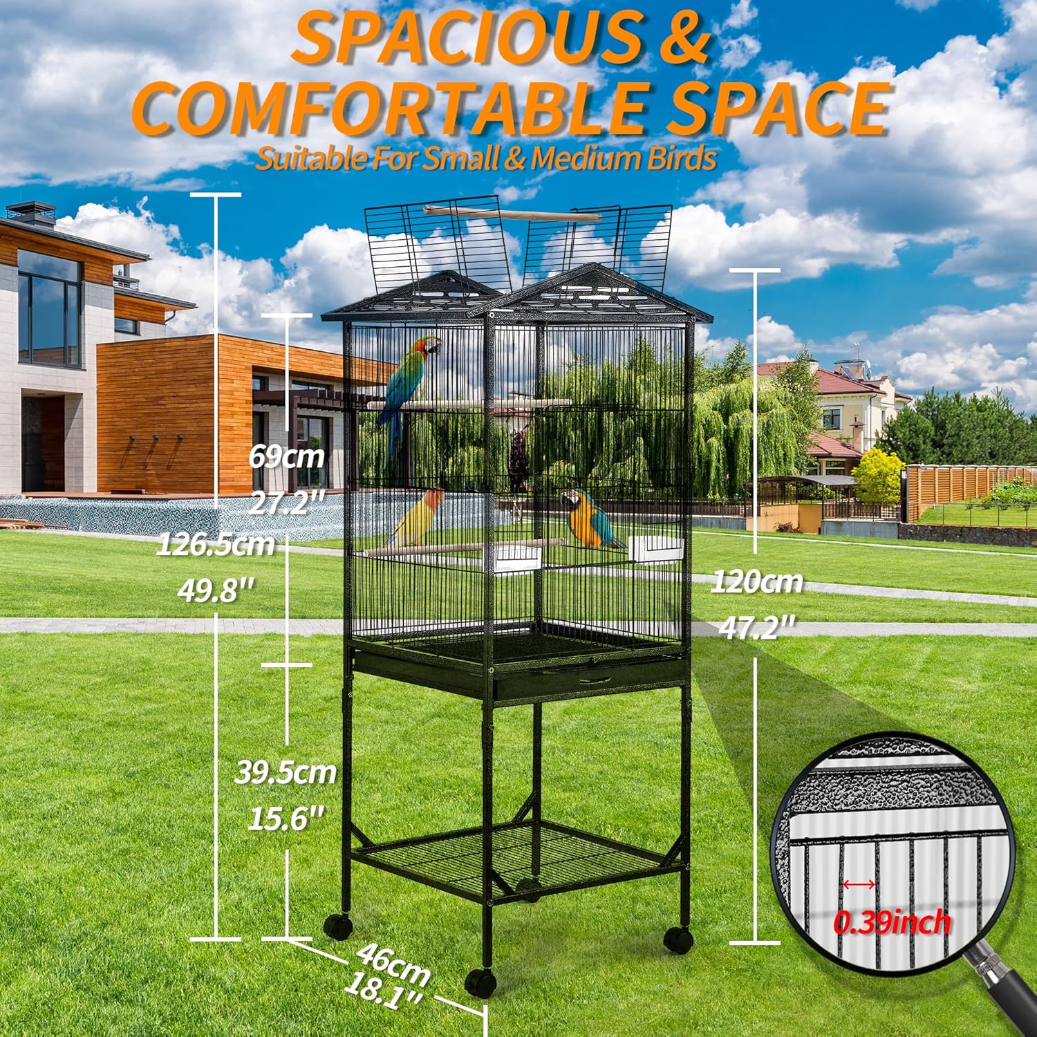 Bird Cage 47 inch Wrought Iron Parakeets Cage with Play Open Top and Rolling Stand Medium Small Bird Cage for Parrots, Budgerigars, Parakeets, Cockatiels, Lovebirds