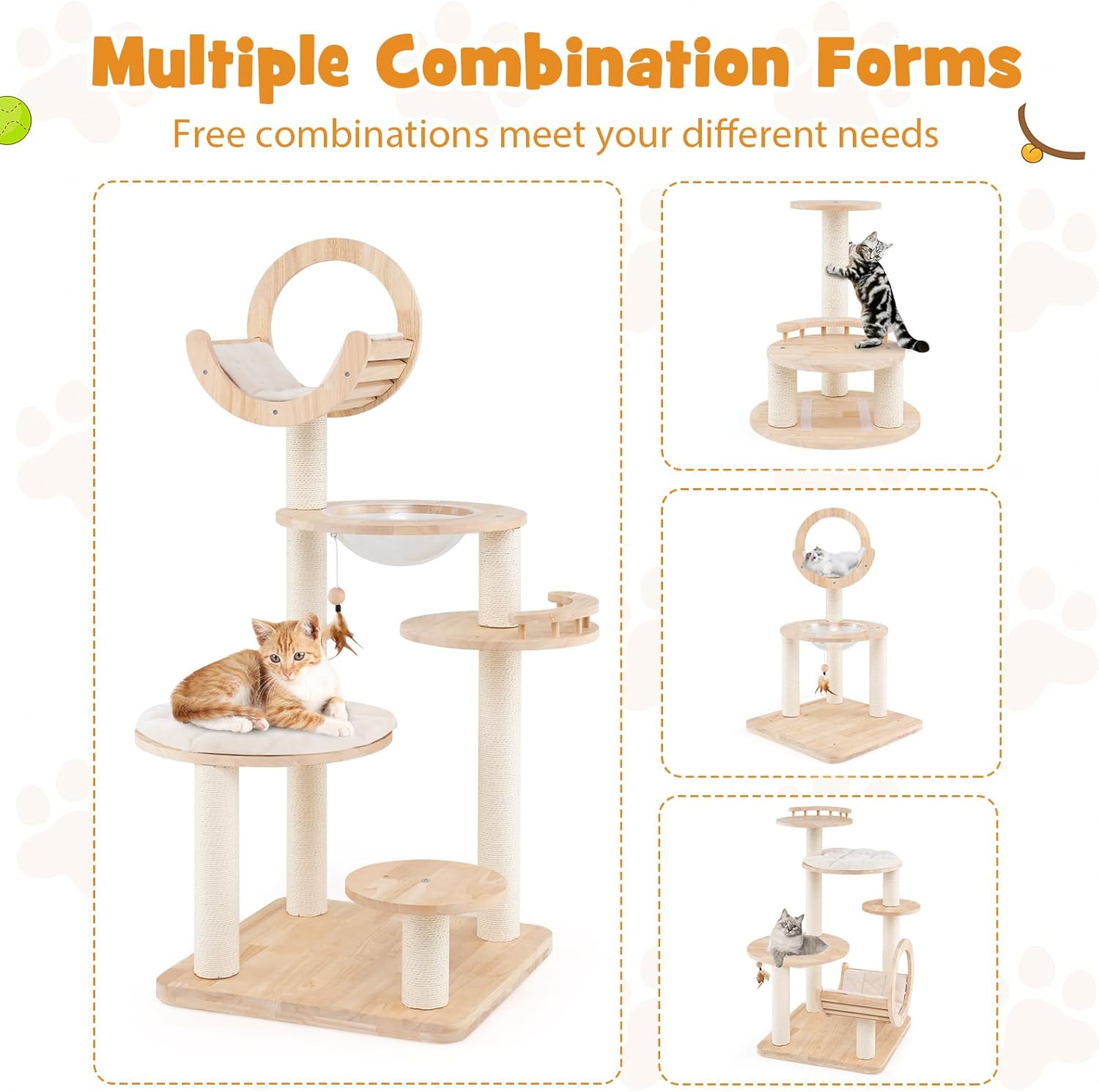 - Durable & Stable Structure: The multi-level cat tree is well balanced with a wide thickened base. And the kitten activity center is crafted with solid rubber wood, which is known for its sturdiness and resistance to cracking, thus ensuring long lifespan.