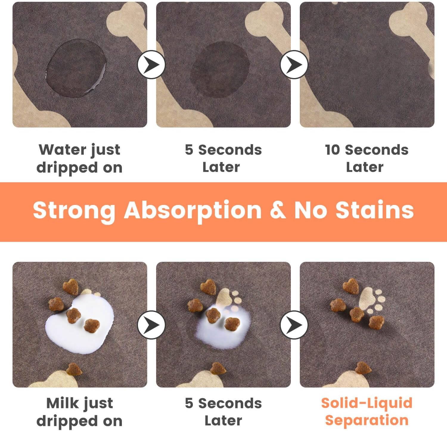 - 【Strong Absorbent & Stain-Resistant】Our dog food mat boasts exceptional absorbency, quickly soaking up any spilled water & milk and leaving no traces behind. It effectively prevents wet paws and keeps your pet's eating area clean.