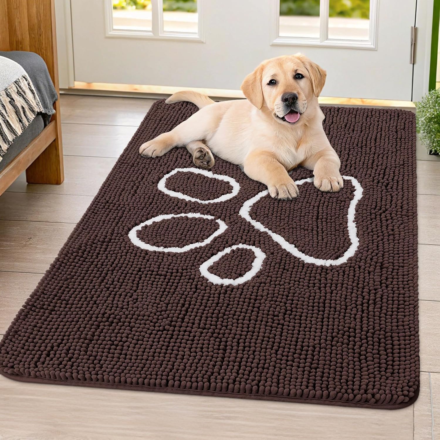 Smiry Dog Door Mat for Muddy Paws, Absorbent Dirt Trapper Non Slip Quick Dry Washable Chenille Mat for Mud Dogs, Entry Rug for Indoor and Outdoor (40x32 Inches, Brown and White)