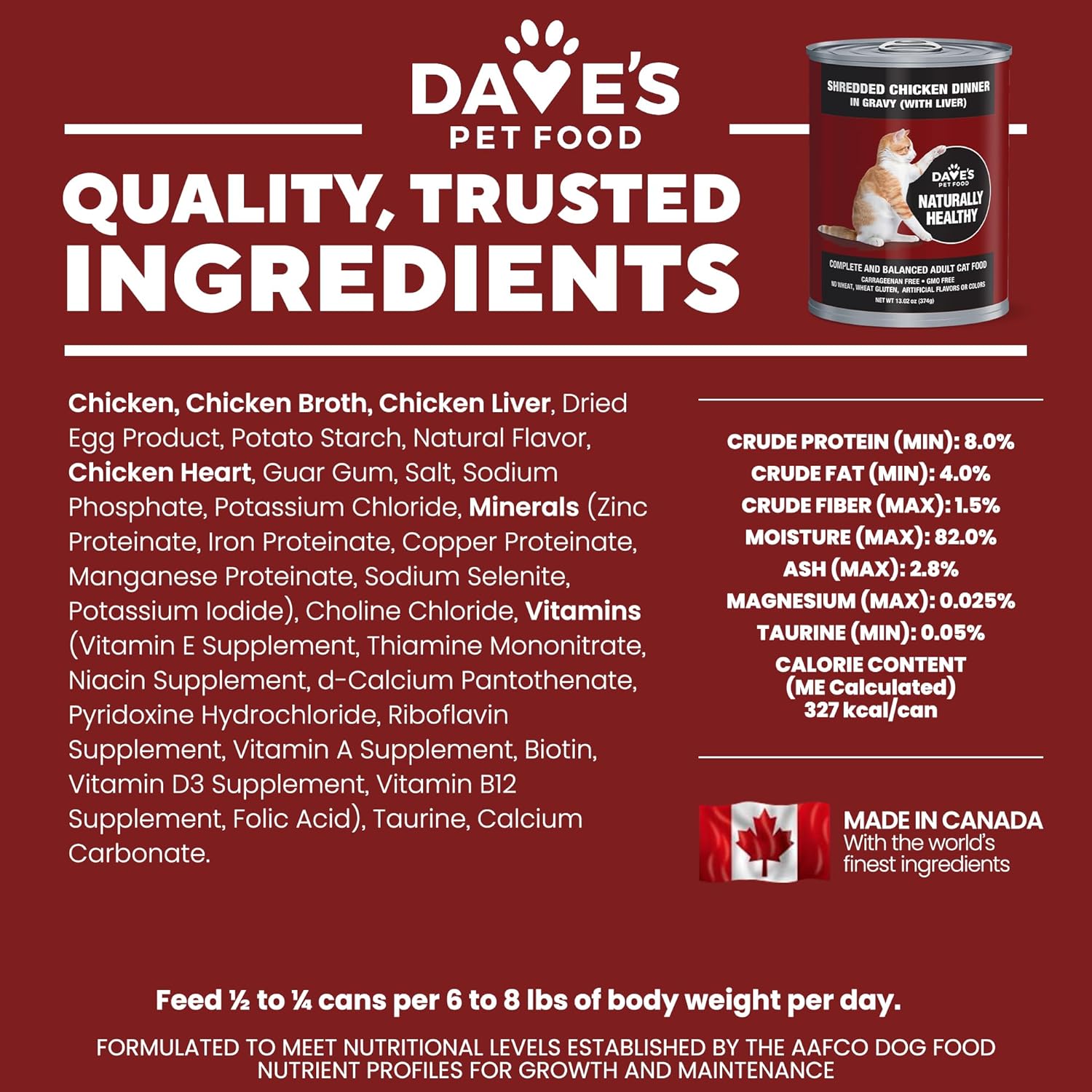 Dave's Pet Food Grain Free Wet Cat Food (Shredded Chicken in Gravy), Made in Canada Naturally Healthy Canned Cat Food, 13.2 oz (12 Pack)