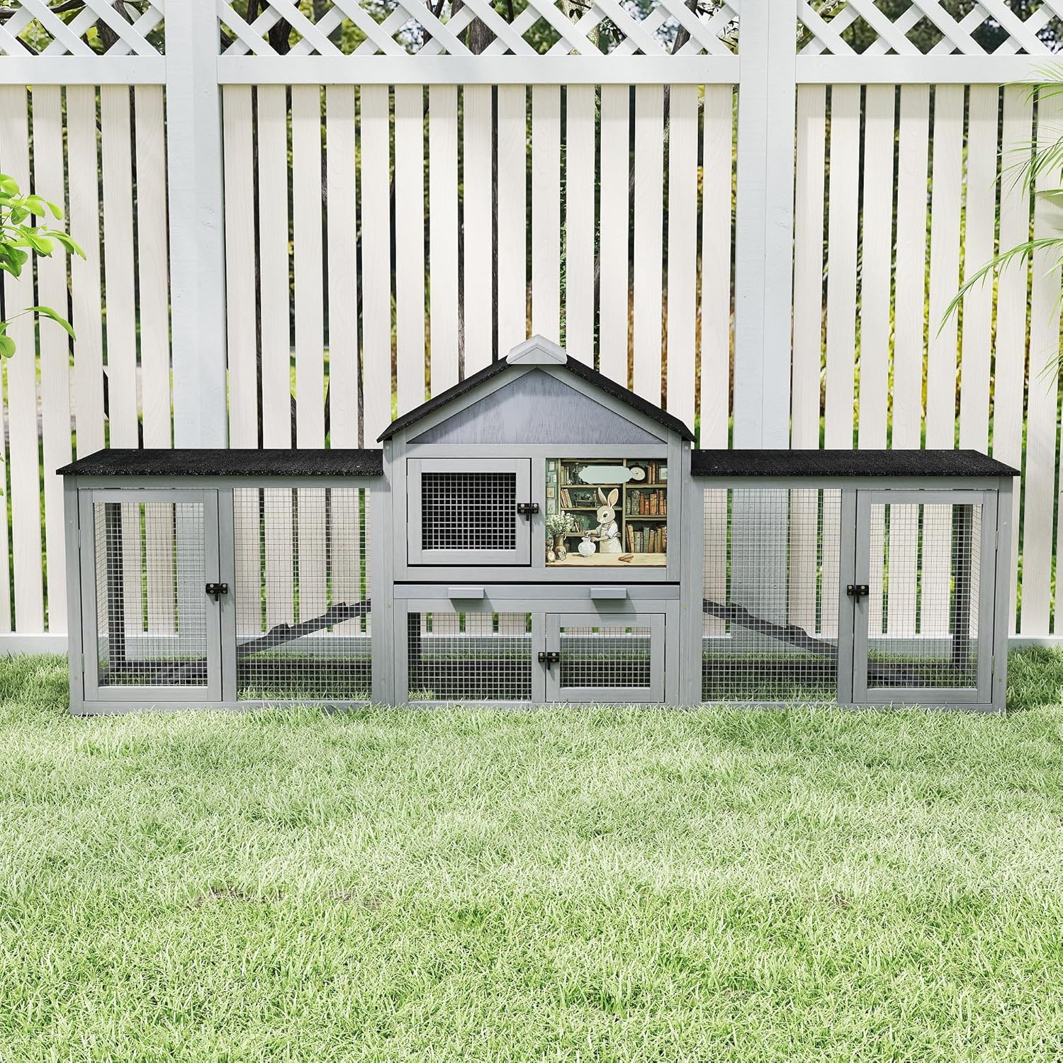 COZIWOW 82inches Extra Large Wood Rabbit Hutch Outdoor Easy to Assemble and Stable Bunny Cage Indoor with Cleaning Tray & Waterproof Roof for Small and Medium Bunny Rabbit Chick (Grey)
