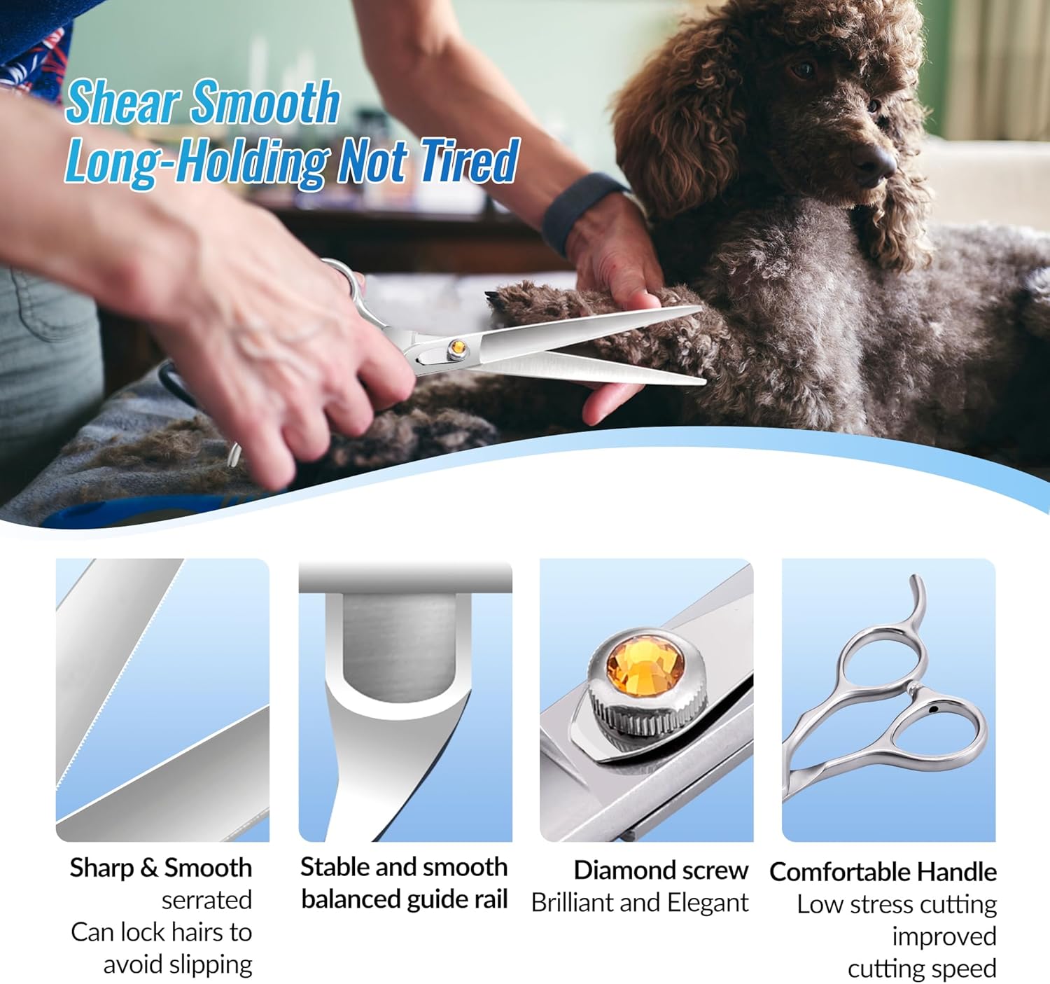 - Features: These pet straight scissors are 7 inches long with ergonomic handles that fit most people. Fine polished brushed surface with delicate metal texture. Precise adjustable screws effectively prevent the screws from loosening due to prolonged use.