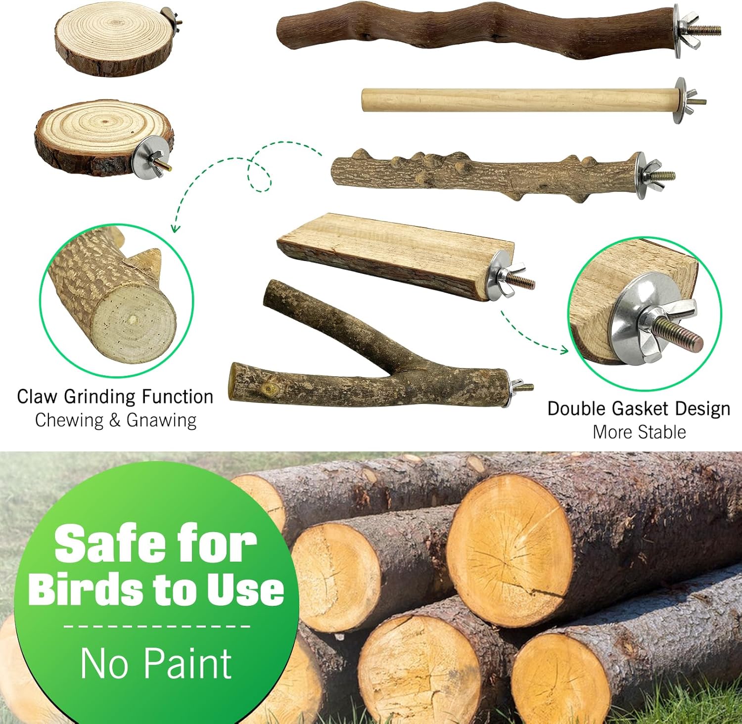 - NATURAL PERCHES: These natural bird perches decorate your bird cage, provide hours of fun for your bird every day, and reduce pet aggression and loneliness. They are suitable for chewing and gnawing, and also for sharpening off your bird's claws and keeping the beak in shape and condition by chewing and gnawing on the perches. These wooden bird perches create a natural habitat for your adorable parrot, making your friends feel as if they are living in nature