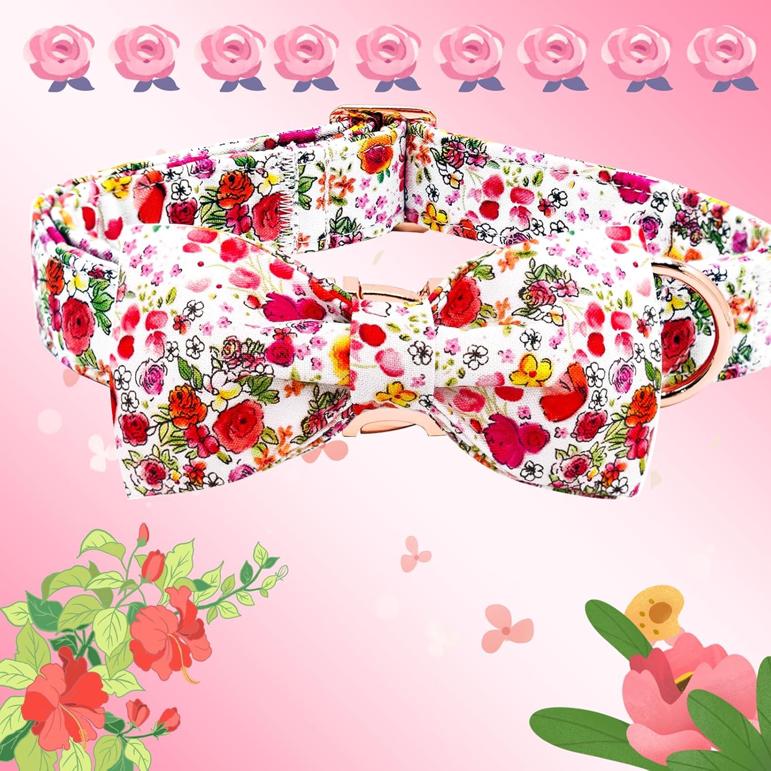 Elegant little tail Dog Collar, Pink Rose Print Pet Collar Summer Dog Collar Durable Metal Buckle Dog Collars Cotton Pet Adjustable Dog Collars for X-Large Dogs