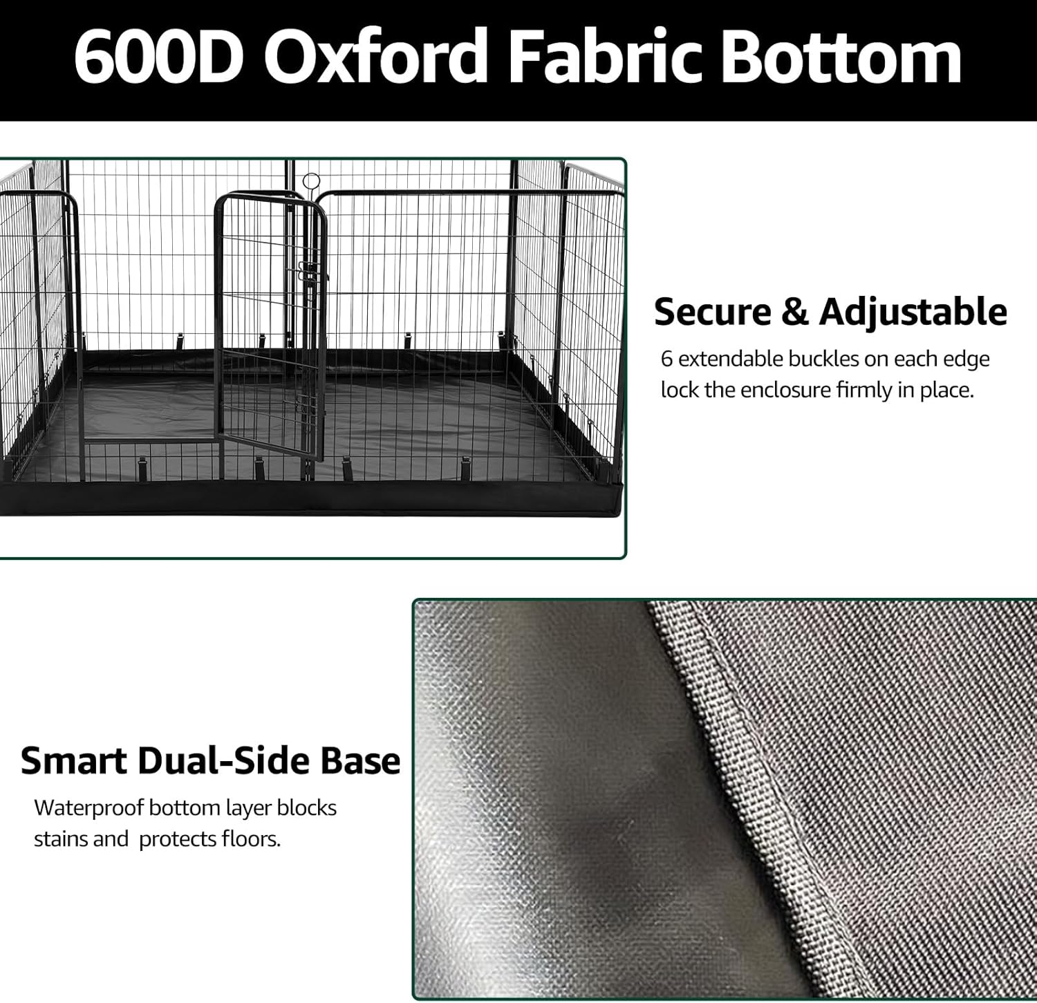- 【Function of the Bottom Pad】The 600D Oxford bottom pad includes 6 hooks per side to secure the playpen, preventing pets from tipping it over while protecting floors. The waterproof surface also provides partial leak resistance.