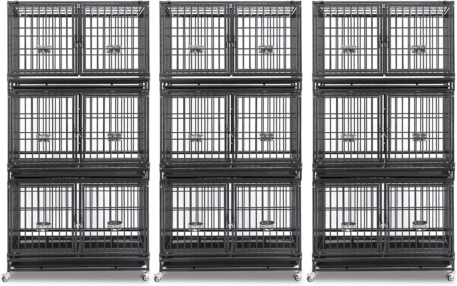 Homey Pet 3 Pack Three Tiers 43 inch Stackable Heavy Duty Dog Crate with Wheels, Indestructible Steel Dog Cage Kennel Indoor with Detachable Divider, Trays, Feeding Bowls, Escape Proof Locks