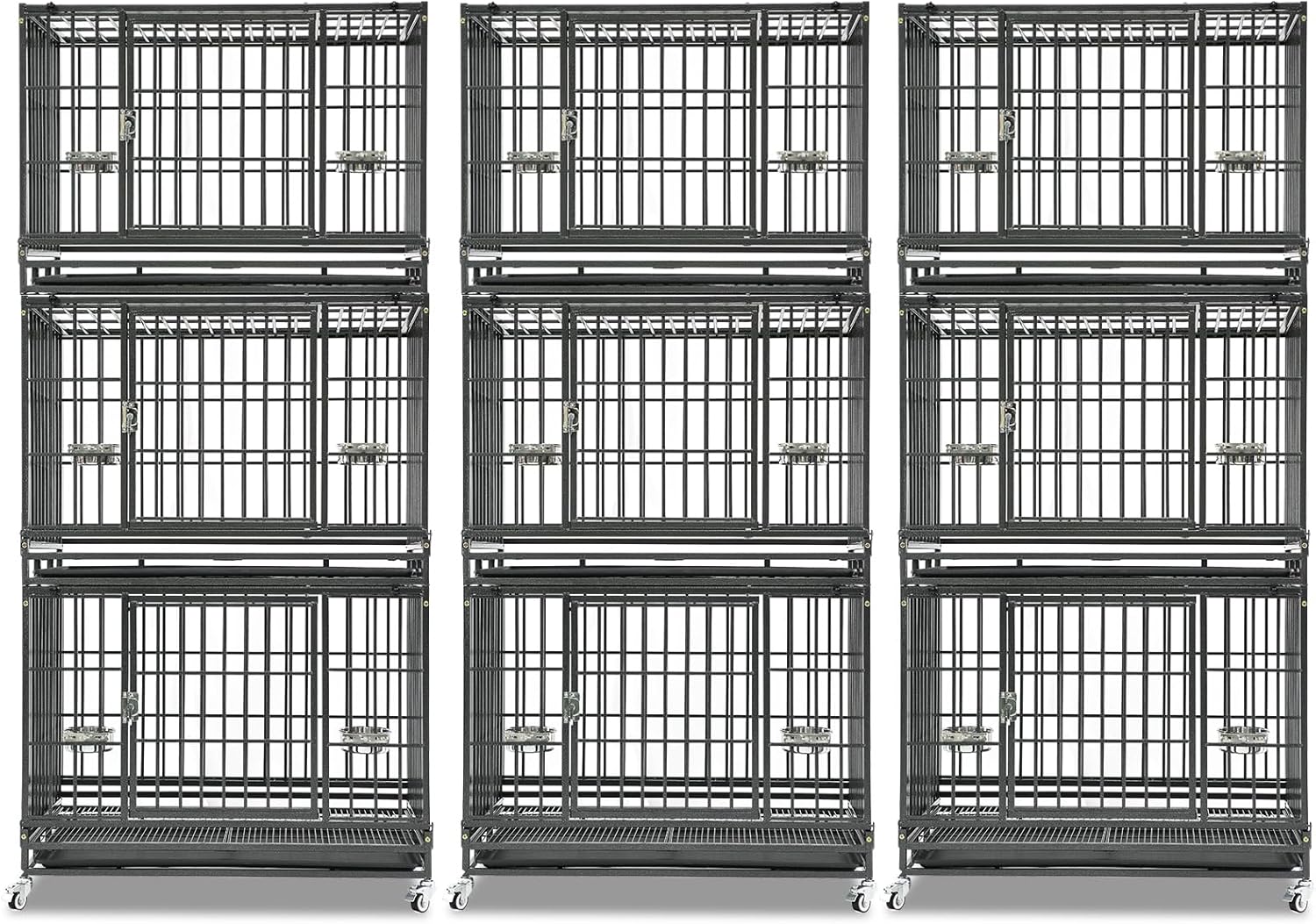 - Homey Pet Dog Crate Bank: Includes: 3 Pack Three tiers stackable dog crate(Size: 37"L x 22.5"W x 82"H). Each unit measure 37"L x 22.5"W x 29.5"H (the interior height: 22.5 inches). Each unit comes with1 x Tray, 2 x Metal Floor Grids, 4 x Locakable Casters, 1 x Safe Locks, 2 x Steel Feeding Bowls (Food & Water). Perfect dog crate cage kennel for medium small dog breeds. Choose spacious dog kennels keep your dog's comfort and safety